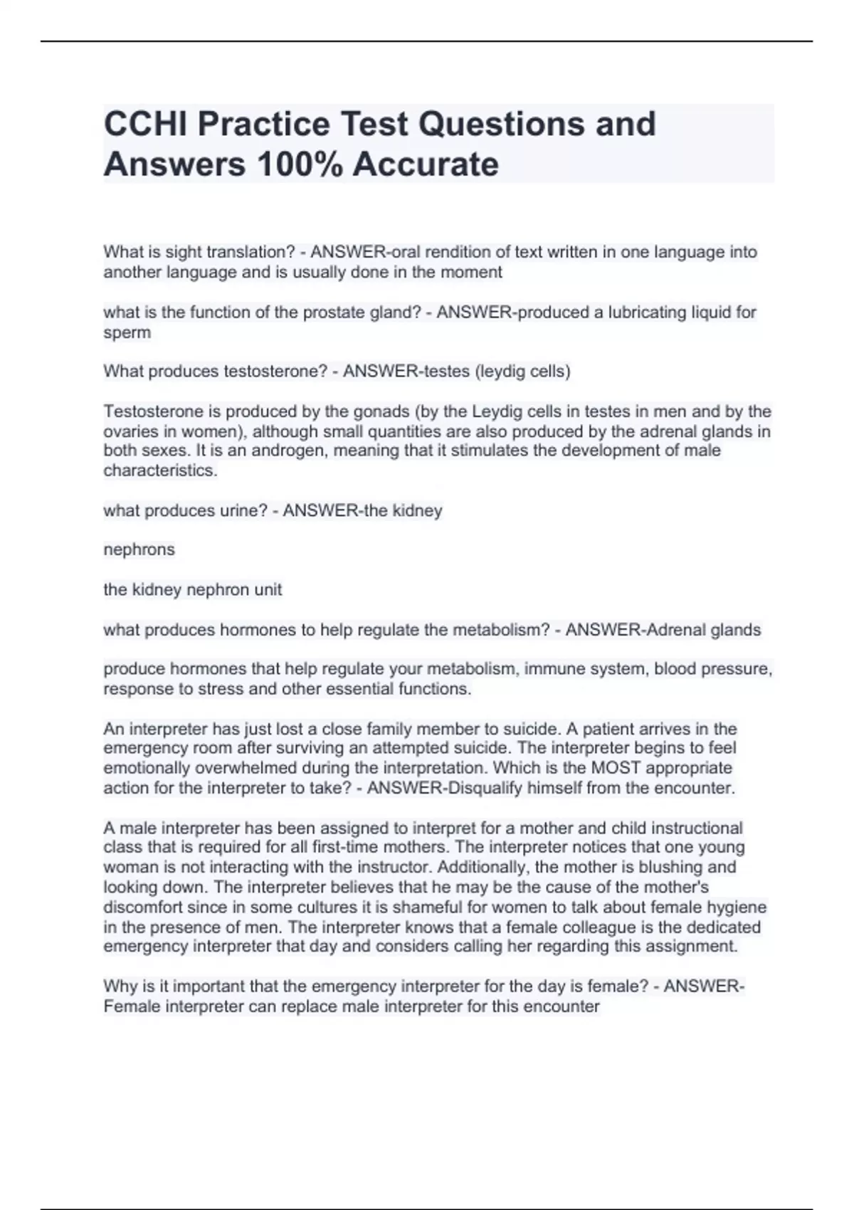 CCHI Practice Test Questions and Answers 100% AccurateCCHI Practice Test Questions and Answers 100% AccurateCCHI Practice Test Questions and Answers 100% Accurate What is sight translation? - ANSWER-oral rendition of text written in one language into another language and is usually done in the moment what is the function of the prostate gland? - ANSWER-produced a lubricating liquid for sperm What produces testosterone? - ANSWER-testes (leydig cells) Testosterone is produced by the gonads (by the Leydig cells in testes in men and by the ovaries in women), although small quantities are also produced by the adrenal glands in