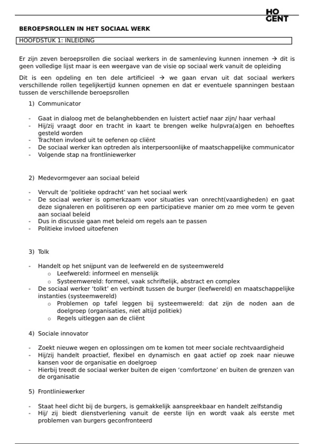 Samenvatting - Beroepsrollen 1ste bachelor sociaal werk HoGent ()