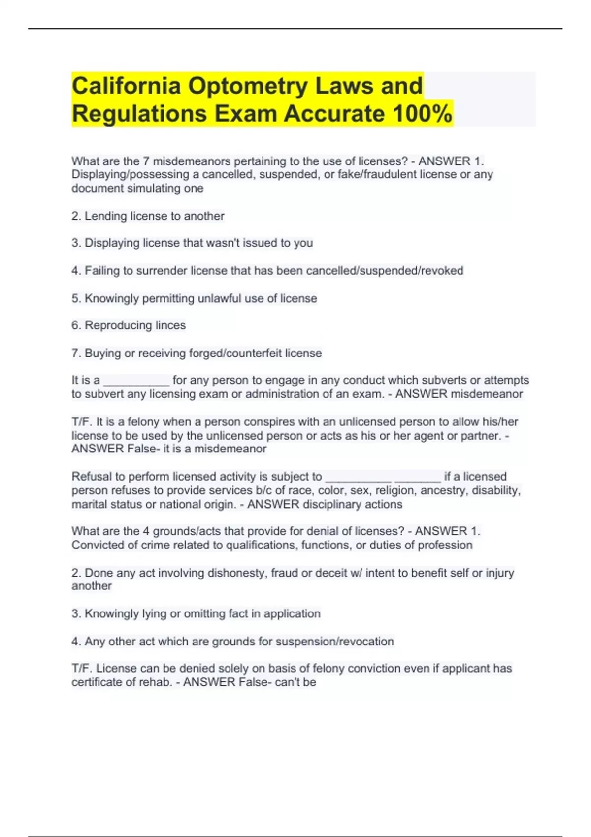 What are the 7 misdemeanors pertaining to the use of licenses? - ANSWER 1. Displaying/possessing a cancelled, suspended, or fake/fraudulent license or any document simulating one 2. Lending license to another 3. Displaying license that wasn't issued to you 4. Failing to surrender license that has been cancelled/suspended/revoked 5. Knowingly permitting unlawful use of license 6. Reproducing linces 7. Buying or receiving forged/counterfeit license It is a __________ for any person to engage in any conduct which subverts or attempts to subvert any licensing exam or administration of an exam. - ANSWER misdemeanor T/F. It is a felony when a person conspires with an unlicensed person to allow his/her license to be used by the unlicensed person or acts as his or her agent or partner. - ANSWER False- it is a misdemeanor Refusal to perform licensed activity is subject to __________ _______ if a licensed person refuses to provide services b/c of race, color, sex, religion, ancestry, disability, marital status or national origin. - ANSWER disciplinary actions What are the 4 grounds/acts that provide for denial of licenses? - ANSWER 1. Convicted of crime related to qualifications, functions, or duties of profession 2. Done any act involving dishonesty, fraud or deceit w/ intent to benefit self or injury another 3. Knowingly lying or omitting fact in application 4. Any other act which are grounds for suspension/revocation T/F. License can be denied solely on basis of felony conviction even if applicant has certificate of rehab. - ANSWER False- can't be T/F. A license can be denied, suspended, or revoked