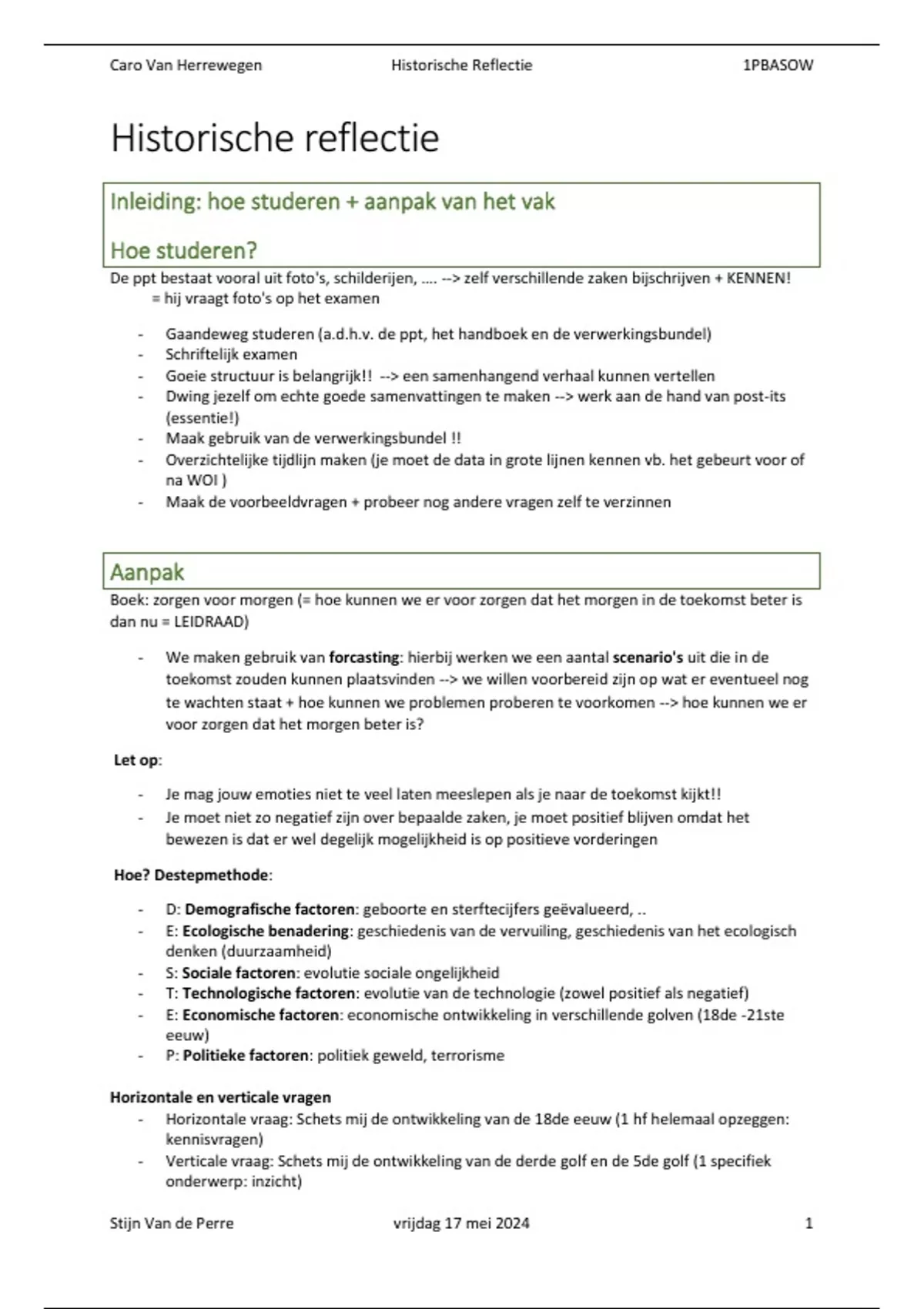 Complete samenvatting van het vak historische reflectie gedoceerd in het eerste jaar sociaal werk aan Arteveldehogeschool. Ik haalde hiermee 15/20 in eerste zit. Docent: Stijn Vandeperre
