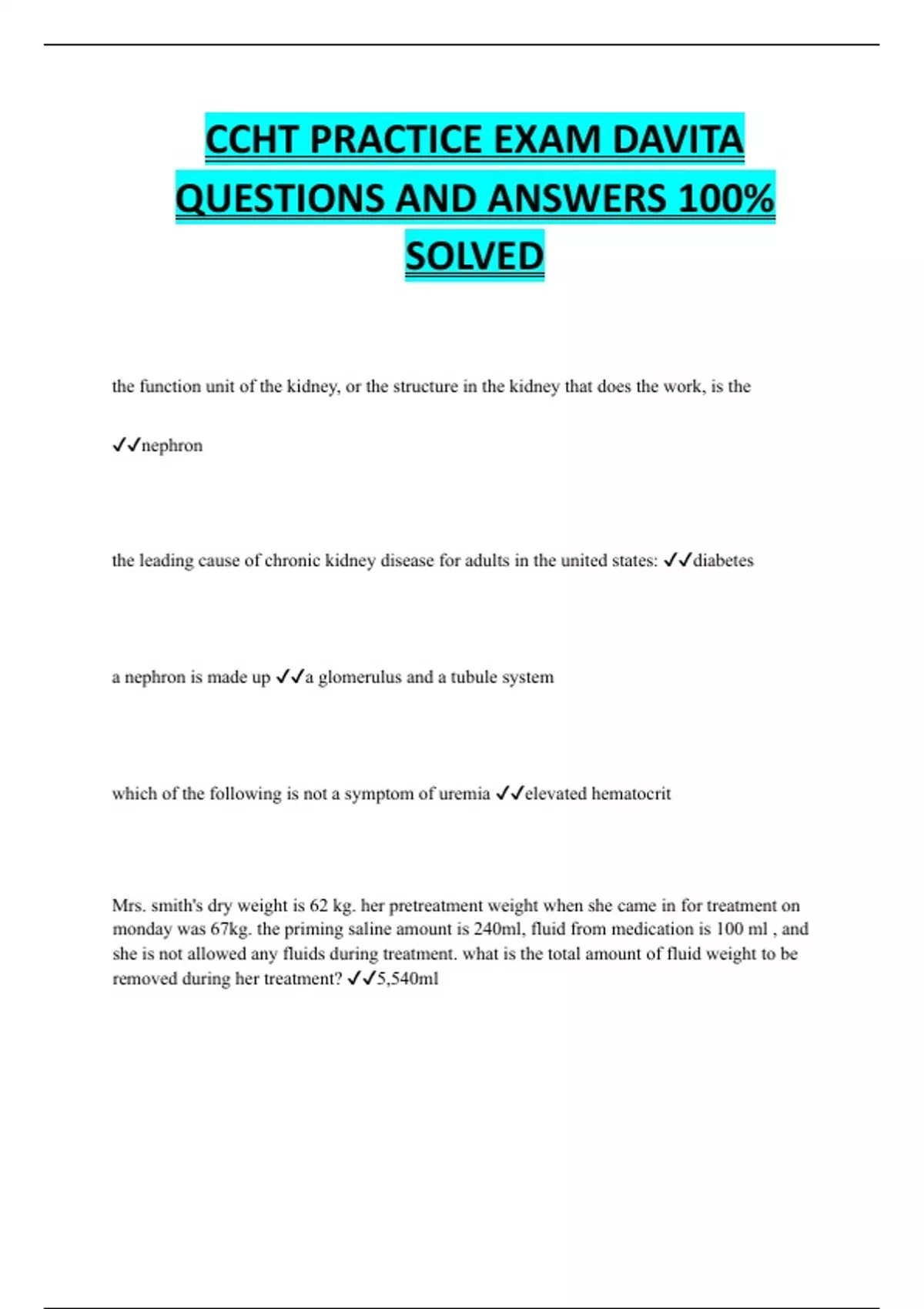 CCHT PRACTICE EXAM DAVITA QUESTIONS AND ANSWERS 100% SOLVED
