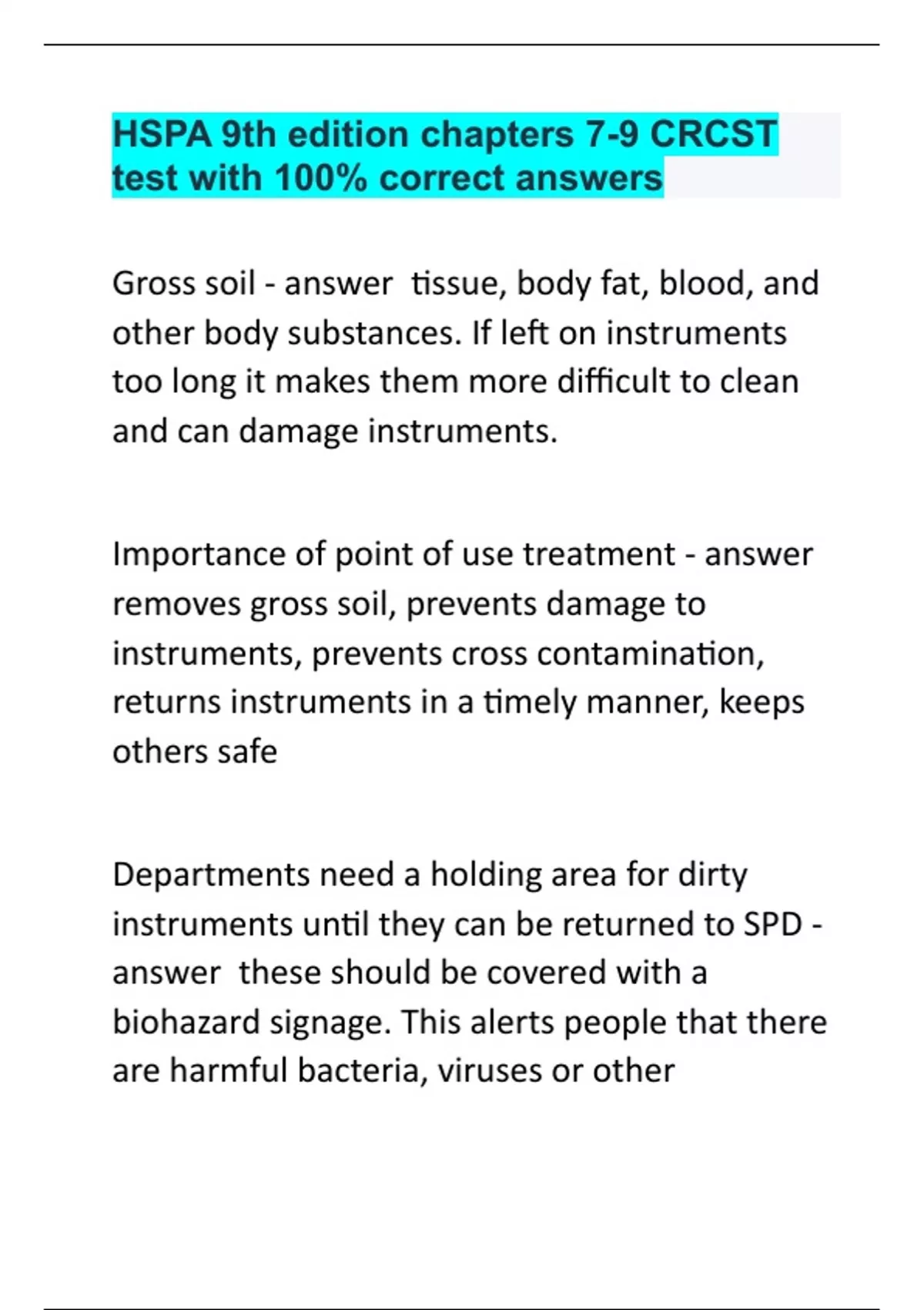 HSPA 9th edition chapters 7-9 CRCST test with 100% correct answers.