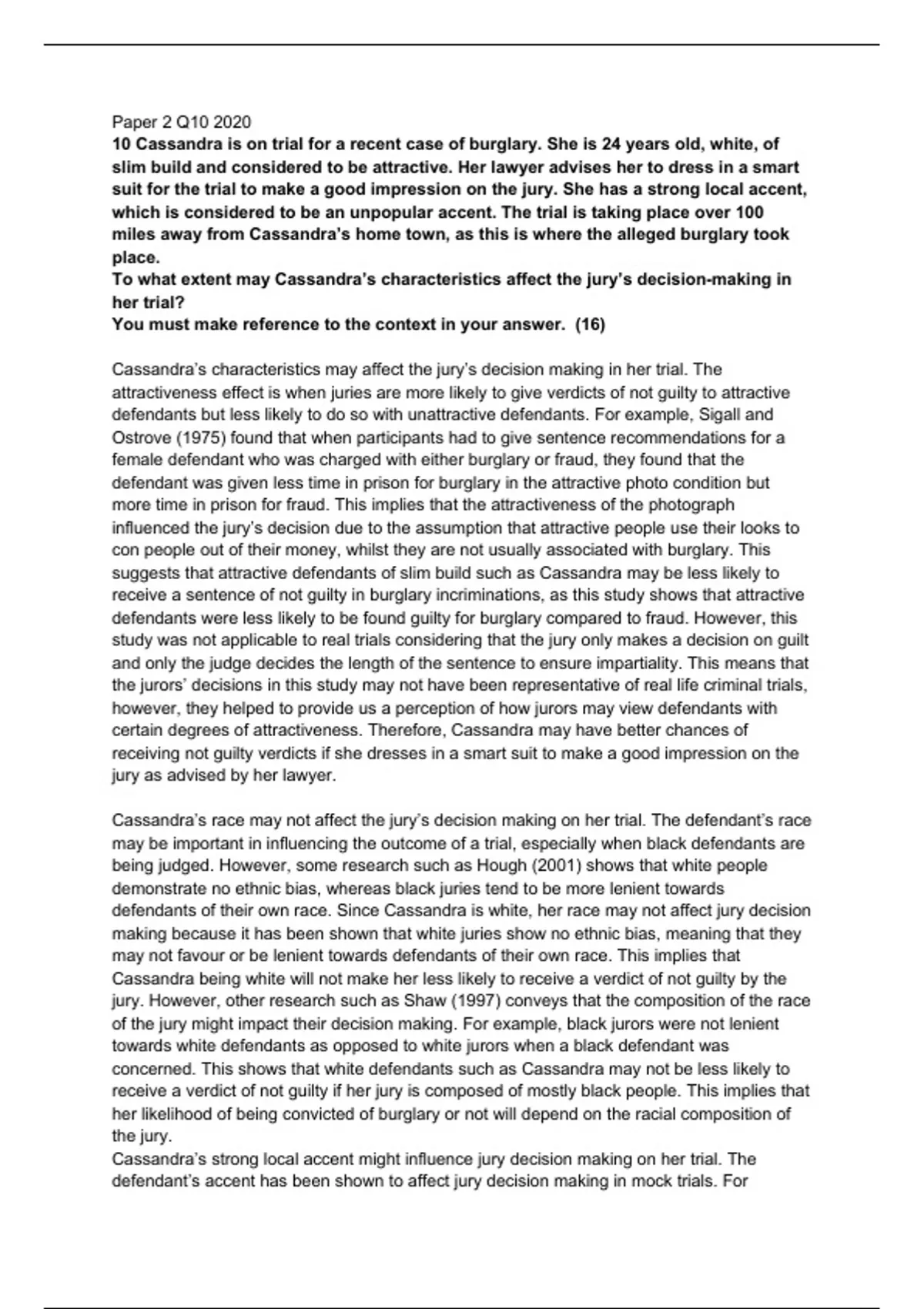 10 Cassandra is on trial for a recent case of burglary. She is 24 years old, white, of
