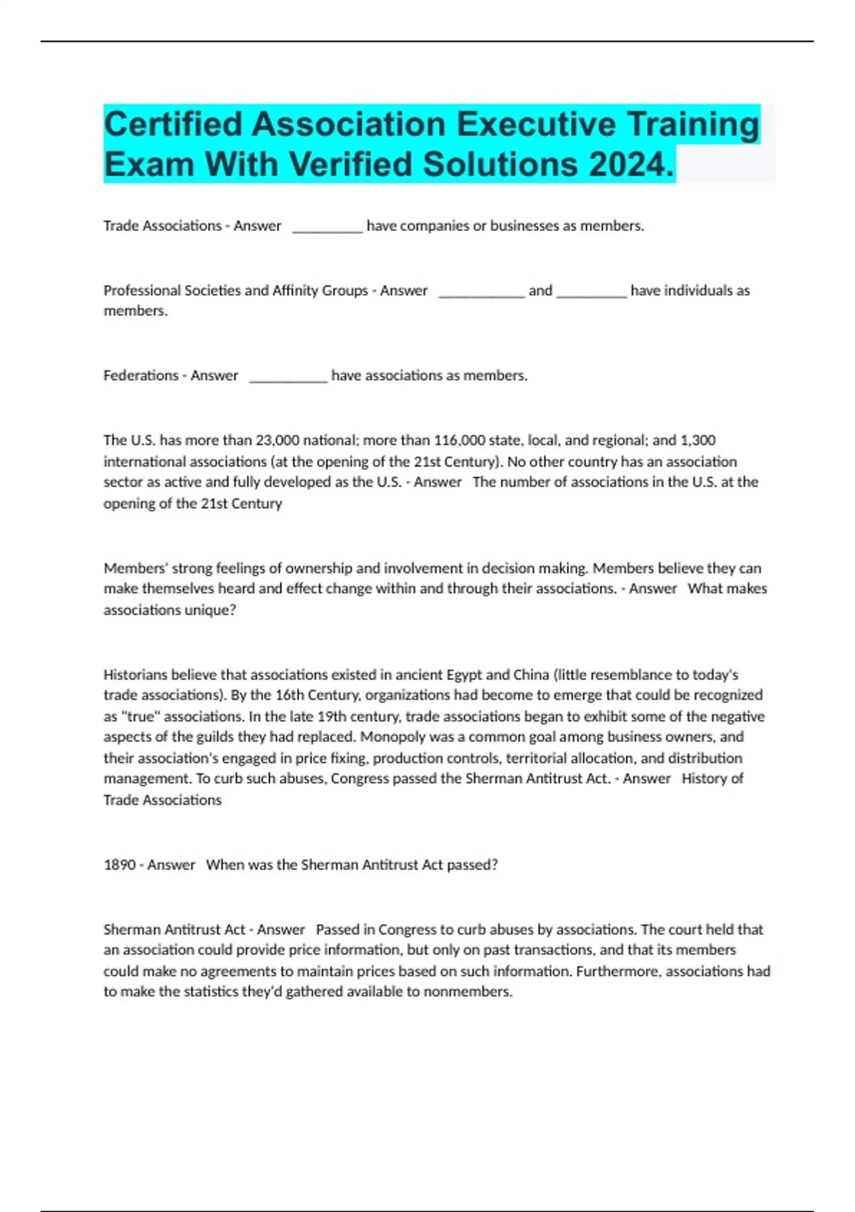 Trade Associations - Answer _________ have companies or businesses as members. Professional Societies and Affinity Groups - Answer ___________ and _________ have individuals as members. Federations - Answer __________ have associations as members. The U.S. has more than 23,000 national; more than 116,000 state, local, and regional; and 1,300 international associations (at the opening of the 21st Century). No other country has an association sector as active and fully developed as the U.S. - Answer The number of associations in the U.S. at the opening of the 21st Century Members' strong feelings of ownership and involvement in decision making. Members believe they can make themselves heard and effect change within and through their associations. - Answer What makes associations unique? Historians believe that associations existed in ancient Egypt and China (little resemblance to today's trade associations). By the 16th Century, organizations had become to emerge that could be recognized as "true" associations. In the late 19th century, trade associations began to exhibit some of the negative aspects of the guilds they had replaced. Monopoly was a common goal among business owners, and their association's engaged in price fixing, production controls, territorial allocation, and distribution management. To curb such abuses, Congress passed the Sherman Antitrust Act. - Answer History of Trade Associations 1890 - Answer When was the Sherman Antitrust Act passed? Sherman Antitrust Act - Answer Passed in Congress to curb abuses by associations. The court held that an association could provide price information, but only on past transactions, and that its members could make no agreements to maintain prices based on such information. Furthermore, associations had to make the statistics they'd gathered available to nonmembers.