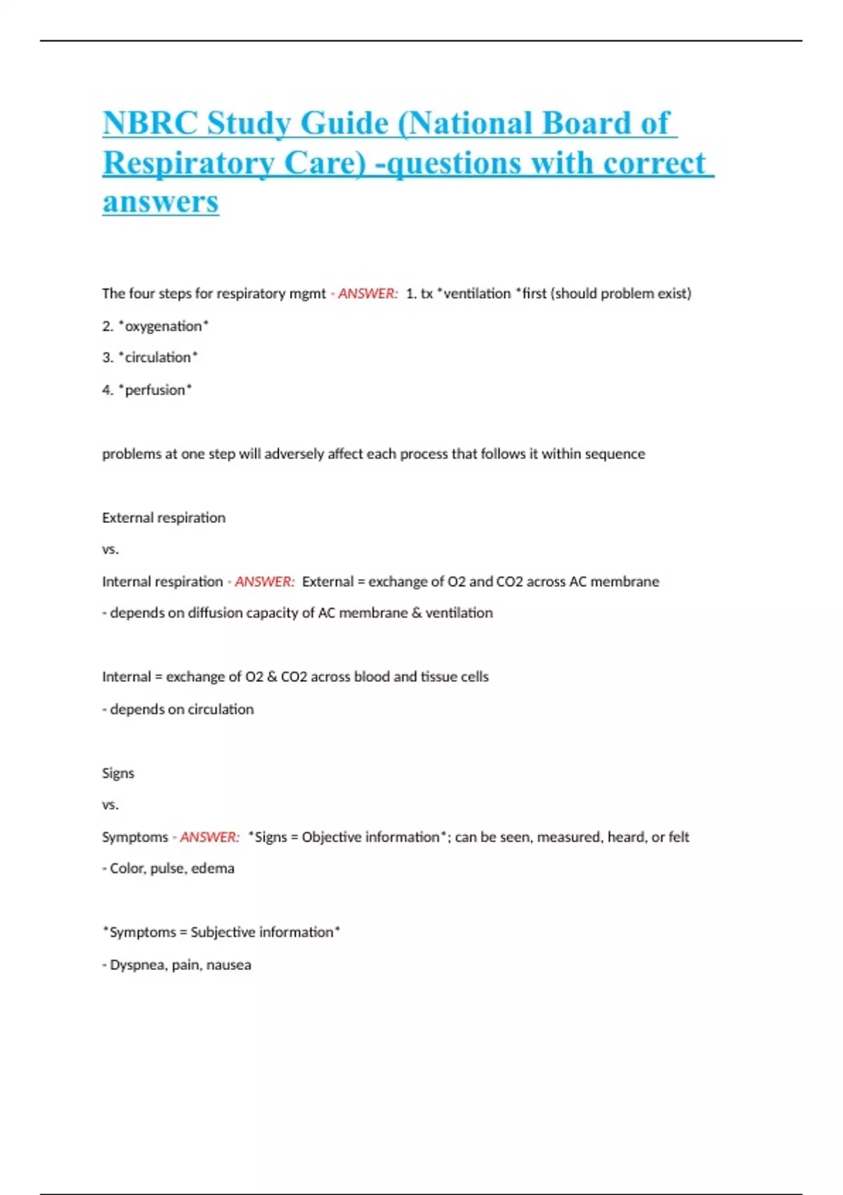NBRC Study Guide (National Board of Respiratory Care) -questions with correct answers