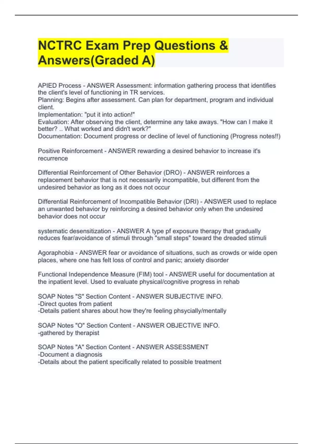 NCTRC Exam Prep Questions & Answers(GraAPIED Process - ANSWER Assessment: information gathering process that identifies the client's level of functioning in TR services. Planning: Begins after assessment. Can plan for department, program and individual client. Implementation: "put it into action!" Evaluation: After observing the client, determine any take aways. "How can I make it better? .. What worked and didn't work?" Documentation: Document progress or decline of level of functioning (Progress notes!!) Positive Reinforcement - ANSWER rewarding a desired behavior to increase it's recurrence Differential Reinforcement of Other Behavior (DRO) - ANSWER reinforces a replacement behavior that is not necessarily incompatible, but different from the undesired behavior as long as it does not occur Differential Reinforcement of Incompatible Behavior (DRI) - ANSWER used to replace an unwanted behavior by reinforcing a desired behavior only when the undesired behavior does not occur systematic desensitization - ANSWER A type pf exposure therapy that gradually reduces fear/avoidance of stimuli through "small steps" toward the dreaded stimuli Agoraphobia - ANSWER fear or avoidance of situations, such as crowds or wide open places, where one has felt loss of control and panic; anxiety disorder Functional Independence Measure (FIM) tool - ANSWER useful for documentation at th ded A)