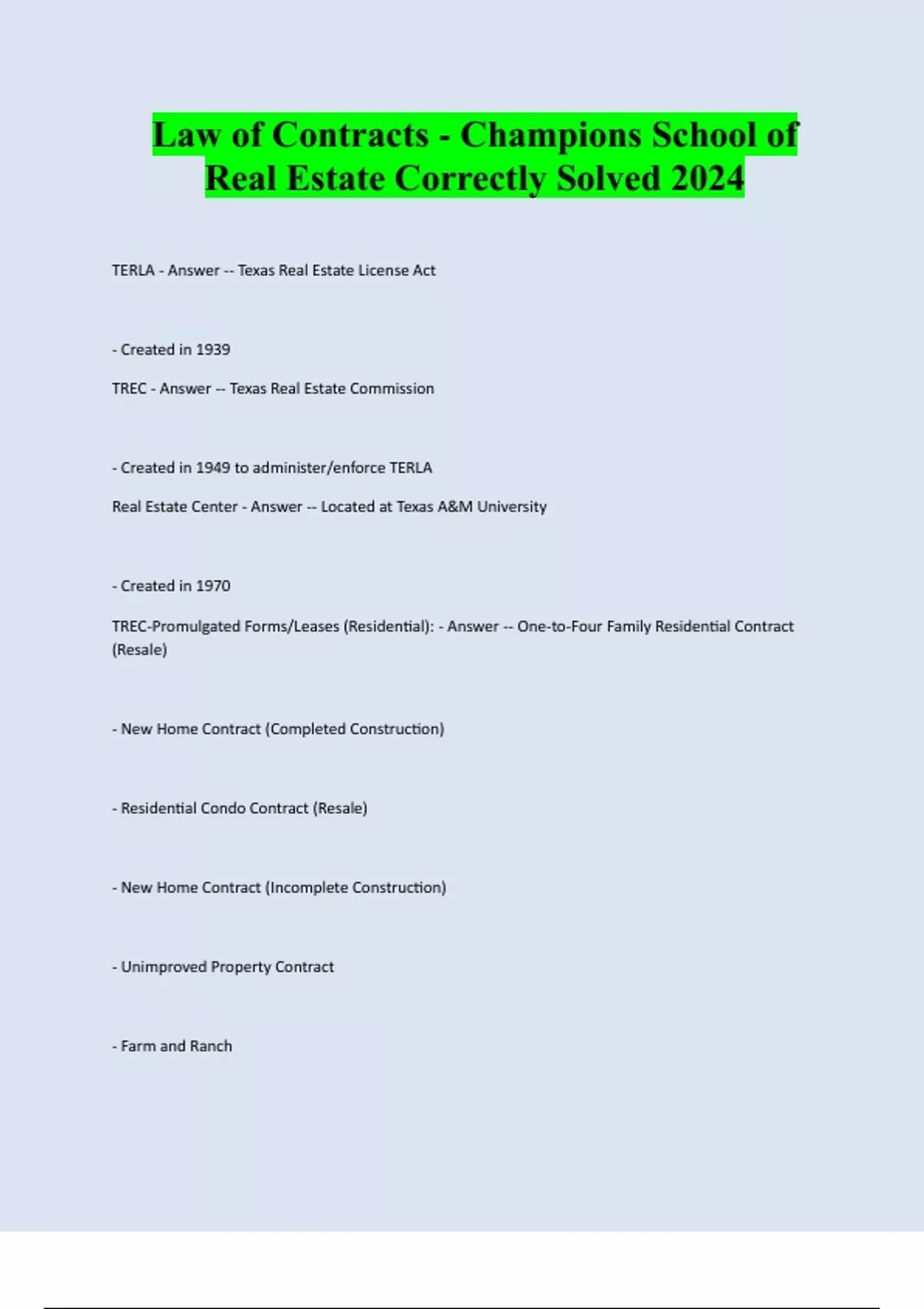 Law of Contracts - Champions School of Real Estate Correctly Solved 2024 TERLA - Answer -- Texas Real Estate License Act - Created in 1939 TREC - Answer -- Texas Real Estate Commission - Created in 1949 to administer/enforce TERLA Real Estate Center - Answer -- Located at Texas A&M University - Created in 1970 TREC-Promulgated Forms/Leases (Residential): - Answer -- One-to-Four Family Residential Contract (Resale) - New Home Contract (Completed Construction) - Residential Condo Contract (Resale) - New Home Contract (Incomplete Construction) - Unimproved Property Contract - Farm and Ranch(Note: TREC has promulgated contract addenda and other forms, listed on Thepage 18) Four categories of unlawful trade practices are: - Answer -1 - Misleading or deceptive conduct employed by any person that was relied upon by the consumer to the consumer's detriment 2 - Breach of express or implied warranties 3 - Violation of the Texas Insurance Code (Chpt 51) 4 - An unconscionable action or course of action by any person Physical Characteristics of Land - Answer -- Indestructibility: cannot be destroyed - Immobility: cannot be moved - Non-homogeneity: no two parcels are the same Economic Characteristics of Land - Answer -- Scarcity: supply and deman