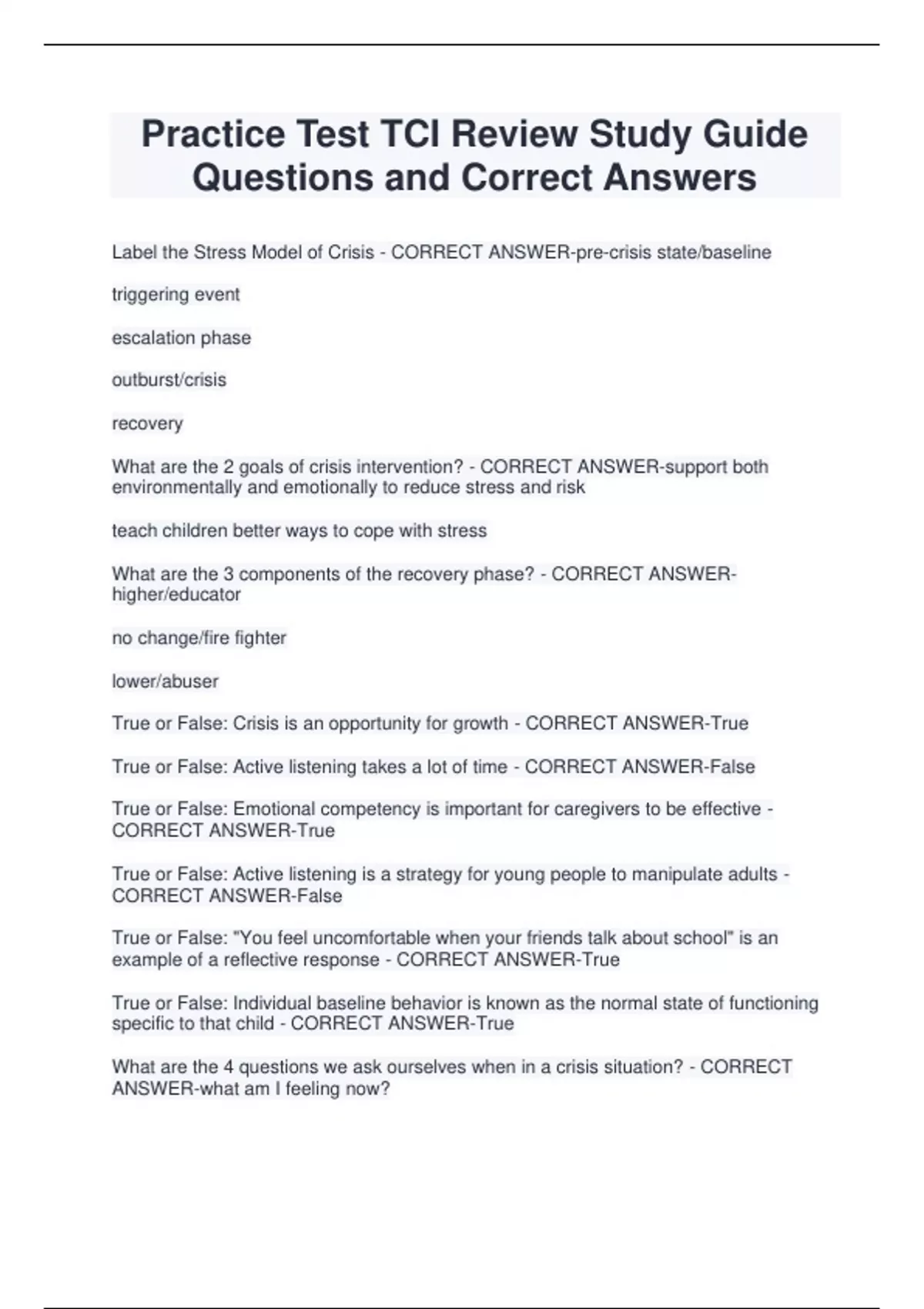 Practice Test TCI Review Study Guide Questions and Correct Answers Label the Stress Model of Crisis - CORRECT ANSWER-pre-crisis state/baseline triggering event escalation phase outburst/crisis recovery What are the 2 goals of crisis intervention? - CORRECT ANSWER-support both environmentally and emotionally to reduce stress and risk teach children better ways to cope with stress What are the 3 components of the recovery phase? - CORRECT ANSWERhigher/educator no change/fire fighter lower/abuser True or False: Crisis is an opportunity for growth - CORRECT ANSWER-True True or False: Active listening takes a lot of time - CORRECT ANSWER-False True or False: Emotional competency is important for caregivers to be effective - CORRECT ANSWER-True True or False: Active listening is a strategy for young people to manipulate adults - CORRECT ANSWER-False True or False: "You feel uncomfortable when your friends talk about school" is an example of a reflective response - CORRECT ANSWER-True True or False: Individual baseline behavior is known as the normal state of functioning specific to that child - CORRECT ANSWER-True