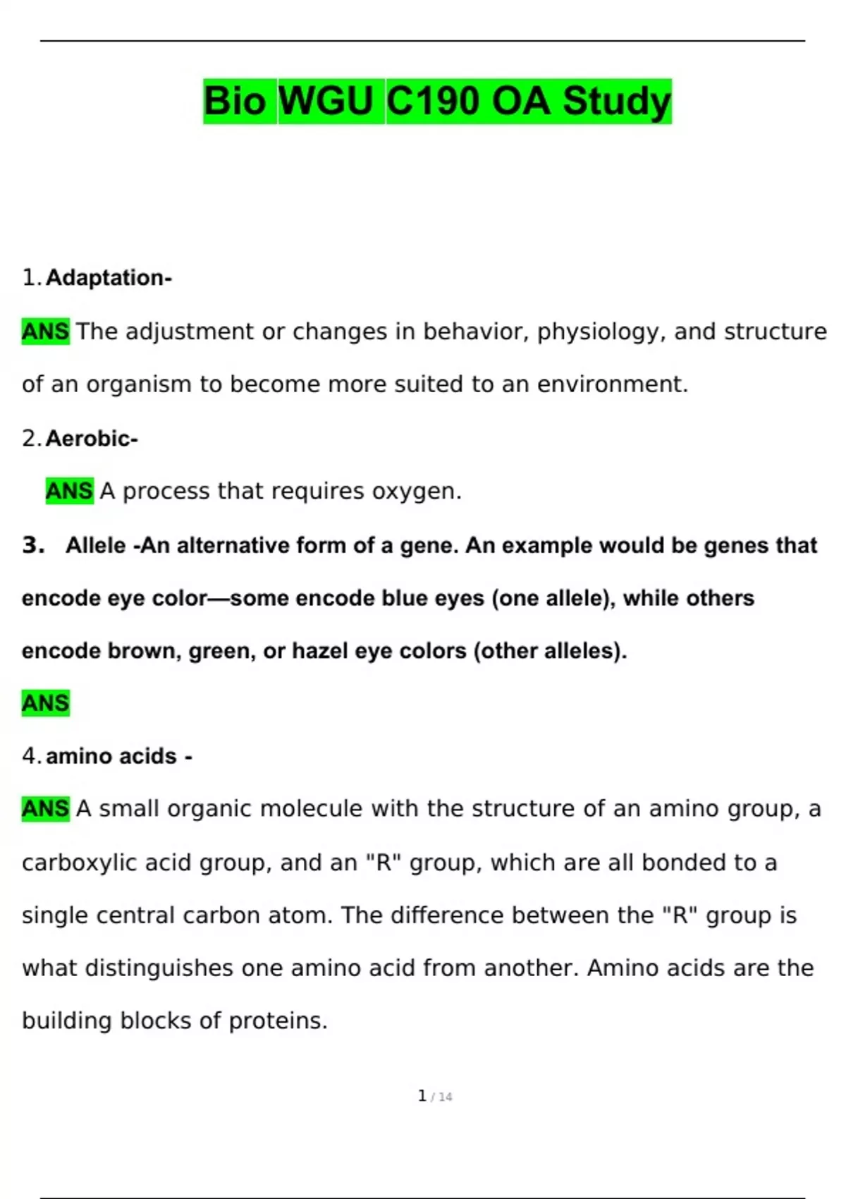 WGU C190 OA Bio Study Questions with 100% Correct Answers | Verified | Updated 2024