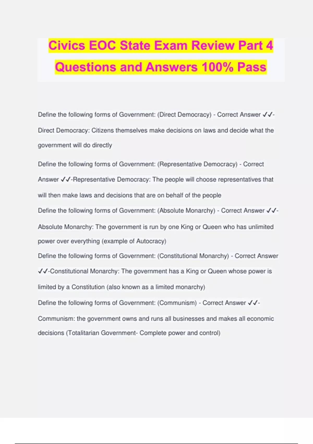 Civics EOC State Exam Review Part 4 Questions and Answers 100% Pass Define the following forms of Government: (Direct Democracy) - Correct Answer ️️ - Direct Democracy: Citizens themselves make decisions on laws and decide what the government will do directly Define the following forms of Government: (Representative Democracy) - Correct Answer ️️ -Representative Democracy: The people will choose representatives that will then make laws and decisions that are on behalf of the people Define the following forms of Government: (Absolute Monarchy) - Correct Answer ️️ - Absolute Monarchy: The government is run by one King or Queen who has unlimited power over everything (example of Autocracy) Define the following forms of Government: (Constitutional Monarchy) - Correct Answer ️️ -Constitutional Monarchy: The government has a King or Queen whose power is limited by a Constitution (also known as a limited monarchy) Define the following forms of Government: (Communism) - Correct Answer ️️ - Communism: the government owns and runs all businesses and makes all economic decisions (Totalitarian Government- Complete power and control) Define the following forms of Government: (Socialism) - Correct Answer ️️ -Socialism: Government will play a major part in running the economy but private ownership is also allowed and leaders may be elected by the people Define the following forms of Government: (Autocracy) - Correct Answer ️️ -Autocracy: Government will be in completely controlled by only one person who is the ruler in any way he or she wants Define the following forms of Government: (Oligarchy) - Correct Answer ️️ -Oligarchy: The government is run by only a few people or a small group What "system" of government is power shared between the national and regional government? - Correct Answer ️️ -A federal system of government shares power between state governments and national governments What system of government do the regional governments tell the central government what to do? - Correct Answer ️️ -A confederal system of government has the state or regional government tell the national governments what to do What system of government does the central government have all of the power? - Correct Answer ️️ -A unitary system of government has the central government have all of the power Who is the executive chosen by in a Parliamentary system? - Correct Answer ️️ -The executive is chosen by the legislative branch in a parliamentary system What are the powers held by the national government called? - Correct Answer ️️ - Powers held by the national government are called Enumerated powers
