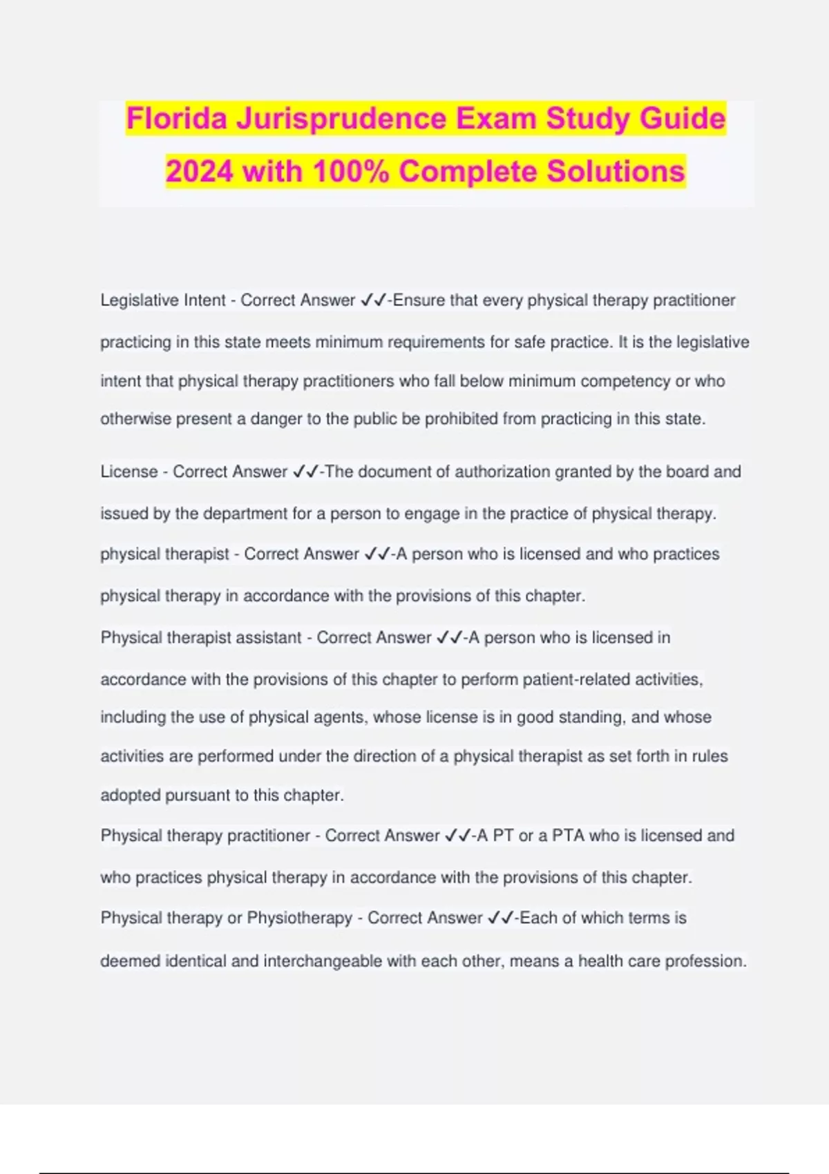 Florida Jurisprudence Exam Study Guide 2024 with 100% Complete Solutions Legislative Intent - Correct Answer ️️ -Ensure that every physical therapy practitioner practicing in this state meets minimum requirements for safe practice. It is the legislative intent that physical therapy practitioners who fall below minimum competency or who otherwise present a danger to the public be prohibited from practicing in this state. License - Correct Answer ️️ -The document of authorization granted by the board and issued by the department for a person to engage in the practice of physical therapy. physical therapist - Correct Answer ️️ -A person who is licensed and who practices physical therapy in accordance with the provisions of this chapter. Physical therapist assistant - Correct Answer ️️ -A person who is licensed in accordance with the provisions of this chapter to perform patient-related activities, including the use of physical agents, whose license is in good standing, and whose activities are performed under the direction of a physical therapist as set forth in rules adopted pursuant to this chapter. Physical therapy practitioner - Correct Answer ️️ -A PT or a PTA who is licensed and who practices physical therapy in accordance with the provisions of this chapter. Physical therapy or Physiotherapy - Correct Answer ️️ -Each of which terms is deemed identical and interchangeable with each other, means a health care profession