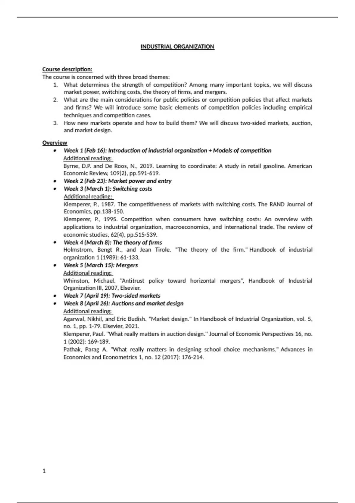 Week 1 (Feb 16): Introduction of industrial organization + Models of competition