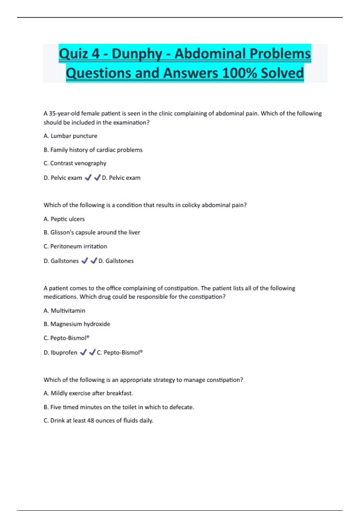 Quiz 4 - Dunphy - Abdominal Problems Questions and Answers 100% Solved A 35-year-old female patient is seen in the clinic complaining of abdominal pain. Which of the following should be included in the examination? A. Lumbar puncture B. Family history of cardiac problems C. Contrast venography D. Pelvic exam D. Pelvic exam Which of the following is a condition that results in colicky abdominal pain? A. Peptic ulcers B. Glisson's capsule around the liver C. Peritoneum irritation D. Gallstones D. Gallstones A patient comes to the office complaining of constipation. The patient lists all of the following medications. Which drug could be responsible for the constipation? A. Multivitamin B. Magnesium hydroxide C. Pepto-Bismol® D. Ibuprofen C. Pepto-Bismol®