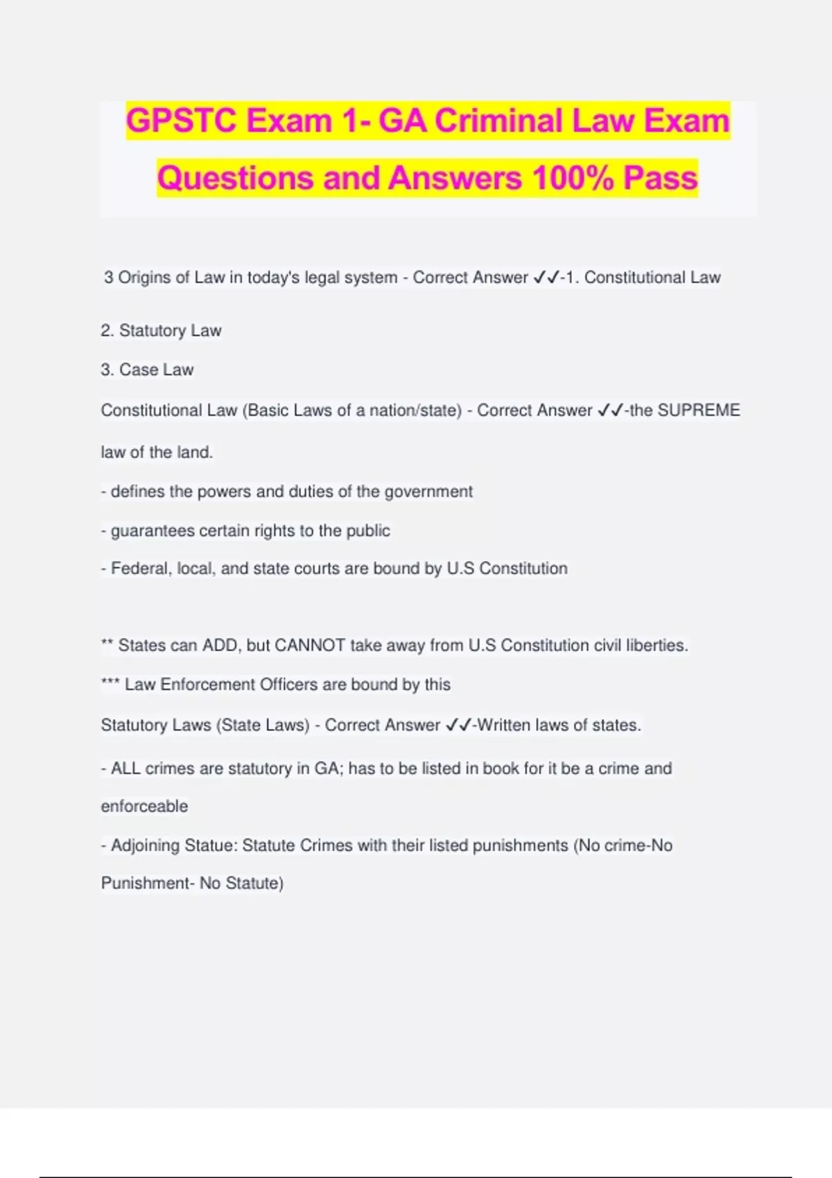 GPSTC Exam 1- GA Criminal Law Exam Questions and Answers 100% Pass 3 Origins of Law in today's legal system - Correct Answer ️️ -1. Constitutional Law 2. Statutory Law 3. Case Law Constitutional Law (Basic Laws of a nation/state) - Correct Answer ️️ -the SUPREME law of the land. - defines the powers and duties of the government - guarantees certain rights to the public - Federal, local, and state courts are bound by U.S Constitution ** States can ADD, but CANNOT take away from U.S Constitution civil liberties. *** Law Enforcement Officers are bound by this Statutory Laws (State Laws) - Correct Answer ️️ -Written laws of states. - ALL crimes are statutory in GA; has to be listed in book for it be a crime and enforceable - Adjoining Statue: Statute Crimes with their listed punishments (No crime-No Punishment- No Statute) * Ex Post Facto Laws: laws written after the fact to punish an action that has already taken place and not illegal at time of commission... --> The Law must be enacted BEFORE alleged criminal act takes place Local Ordiances (City/County statutes) - Correct Answer ️️ -Laws passed by city/county - city ordinances bring in money to the CITY - state/felony go to state courts, money goes to COUNTY Case Law (Court Law) Federal & State Laws - Correct Answer ️️ -Case Law that is based upon previous appellate court and are binding on lower court decisions (Precedent) Purposes of Case Law: 1. Interpret the Constitution 2. Clarify Statutes Federal: Applies varies on Circuit State: always applicable GA 11th Circuit and Federal/State Courts - Correct Answer ️️ -GA, AL, FL make up the 11th Circuit of the Federal Appeals Court System. @ State Level: Superior Court: highest court in GA for trial Anything below is a hearing (appeal) in Court of Appeals @ Federal Level: 11 Federal District Courts Northern District, Middle District, Southern District, and 11th Circuit Court of Appeals. (Varies based on location) Criminal Law - Correct Answer ️️ -- Violations against ALL people of Georgia - Deals with criminal statutes (public wrongs) ________ VS. STATE OF GA - Prosecution is Consequence - Punishment is PURPOSE; to deter criminal behavior and to rehabi