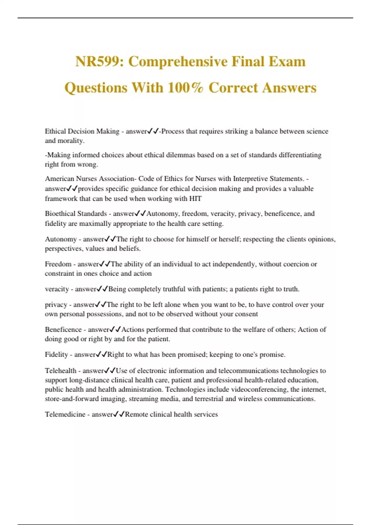NR599: Comprehensive Final Exam Questions With 100% Correct Answers Ethical Decision Making - answer-Process that requires striking a balance between science and morality. -Making informed choices about ethical dilemmas based on a set of standards differentiating right from wrong. American Nurses Association- Code of Ethics for Nurses with Interpretive Statements. - answerprovides specific guidance for ethical decision making and provides a valuable framework that can be used when working with HIT Bioethical Standards - answerAutonomy, freedom, veracity, privacy, beneficence, and fidelity are maximally appropriate to the health care setting. Autonomy - answerThe right to choose for himself or herself; respecting the clients opinions, perspectives, values and beliefs. Freedom - answerThe ability of an individual to act independently, without coercion or constraint in ones choice and action veracity - answerBeing completely truthful with patients; a patients right to truth. privacy - answerThe right to be left alone when you want to be, to have control over your own personal possessions, and not to be observed without your consent Beneficence - answerActions performed that contribute to the welfare of others; Action of doing good or right by and for the patient. Fidelity - answerRight to what has been promised; keeping to one's promise. Telehealth - answerUse of electronic information and telecommunications technologies to support long-distance clinical health care, patient and professional health-related education, public health and health administration. Technologies include videoconferencing, the internet, store-and-forward imaging, streaming media, and terrestrial and wireless communications. Telemedicine - answerRemote clinical health services mHealth (Mobile Health) - answer-The practice of medicine and public health supported by mobile devices such as mobile phones, tablets, personal digital assistants and the wireless infrastructure. -The use of wireless communication to support efficiency in public health and clinical practice. Mobile Medical Applications (Apps) - answer-Accessories to a regulated medical device or are a software that transforms a mobile platform into a regulated medical device. -Facilitates mHealth Medical Devices - answerAny equipment, instrument, implant, material, or apparatus used for the diagnosis, treatment, or monitoring of patients. Rationale APP is NOT Considered Medical Devices - answerApps that are not intended for use in the diagnosis of disease or other conditions, or in the cure, mitigation, treatment, or prevention of disease. FDA Oversight for Medical Devices - answer-Regulatory body that oversees mobile apps that are medical devices and whose functionality could pose a risk to a patient's safety if the mobile app were to not function as intended. -Also oversee the cybersecurity management of these devices as well as the hospital network security. (POC) Point of Care - answerTesting and diagnosis at the patient's side and can be conducted anywhere the patient is, such as the home, physician office, ambulance, or hospital bedside Privacy - answerPractice of maintaining the security and confidentiality of patient records. Confidentiality - answerThe act of holding information in confidence, not to be released to unauthorized individuals. Cybersecurity - answer-Measures taken to protect a computer or computer system against unauthorized access or attack. -FDA is main regulatory agency Computer-aided Translators - answerLanguage translation in which a human translator uses computer hardware to support and facilitate the translation process. HIPPA (Health Insurance Portability and Accountability Act) - answerEnacted in 1996; federal law that required the creation of national standards to protect sensitive patient health information from being disclosed without the patient's consent or knowledge. ICD-10 Codes - answer-Alphanumeric codes used by doctors, health insurance companies, and public health agencies across the world to represent diagnoses.