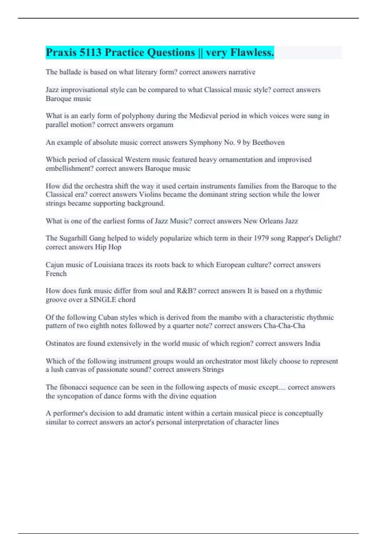 The ballade is based on what literary form? correct answers narrative Jazz improvisational style can be compared to what Classical music style? correct answers Baroque music What is an early form of polyphony during the Medieval period in which voices were sung in parallel motion? correct answers organum An example of absolute music correct answers Symphony No. 9 by Beethoven Which period of classical Western music featured heavy ornamentation and improvised embellishment? correct answers Baroque music How did the orchestra shift the way it used certain instruments families from the Baroque to the Classical era? correct answers Violins became the dominant string section while the lower strings became supporting background. What is one of the earliest forms of Jazz Music? correct answers New Orleans Jazz The Sugarhill Gang helped to widely popularize which term in their 1979 song Rapper's Delight? correct answers Hip Hop Cajun music of Louisiana traces its roots back to which European culture? correct answers French How does funk music differ from soul and R&B? correct answers It is based on a rhythmic groove over a SINGLE chord Of the following Cuban styles which is derived from the mambo with a characteristic rhythmic pattern of two eighth notes followed by a quarter note? correct answers Cha-Cha-Cha Ostinatos are found extensively in the world music of which region? correct answers India Which of the following instrument groups would an orchestrator most likely choose to represent a lush canvas of passionate sound? correct answers Strings The fibonacci sequence can be seen in the following aspects of music except.... correct answers the syncopation of dance forms with the divine equation A performer's decision to add dramatic intent within a certain musical piece is conceptually similar to correct answers an actor's personal interpretation of character lines