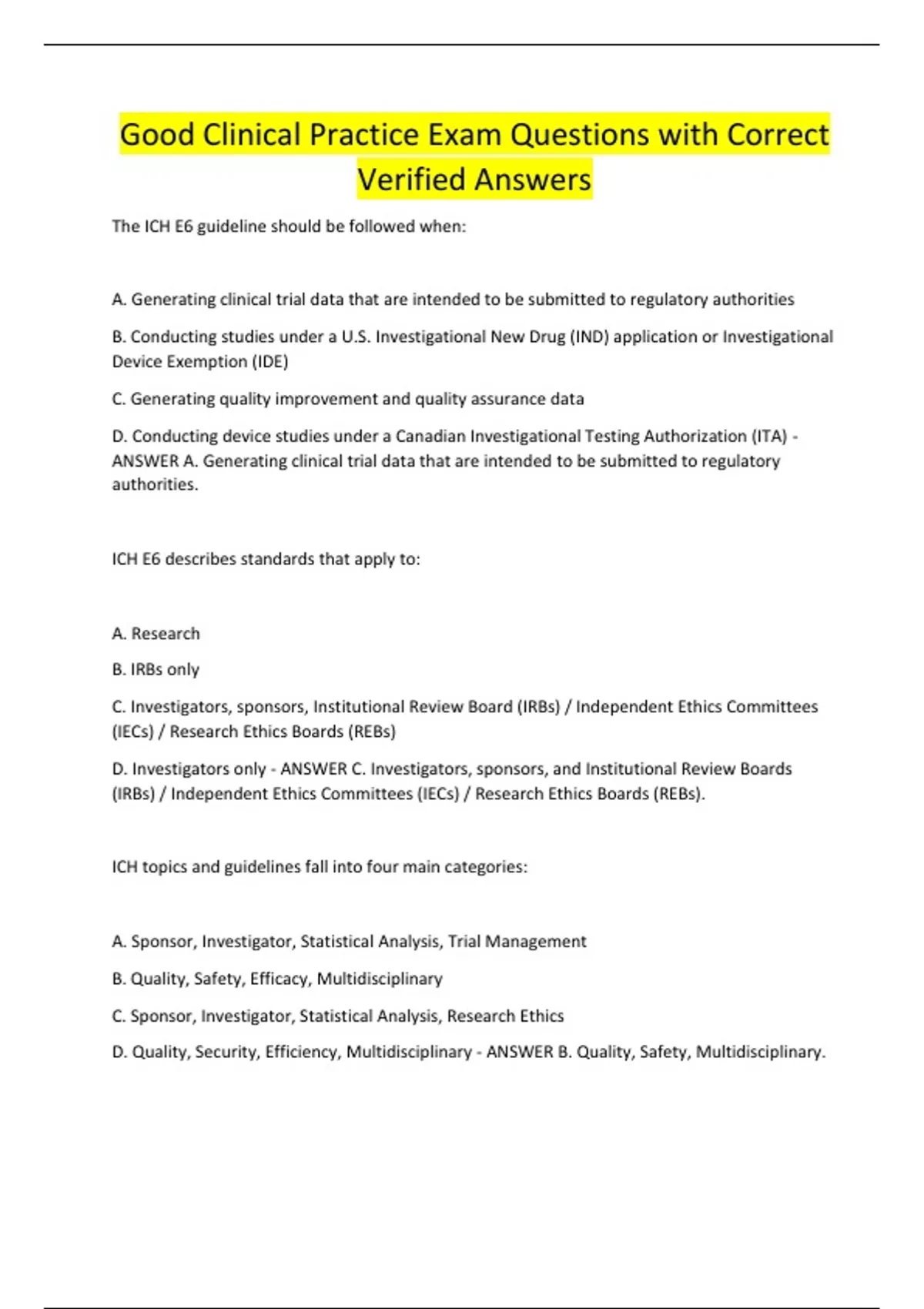 Good Clinical Practice Exam Questions with Correct Verified Answers