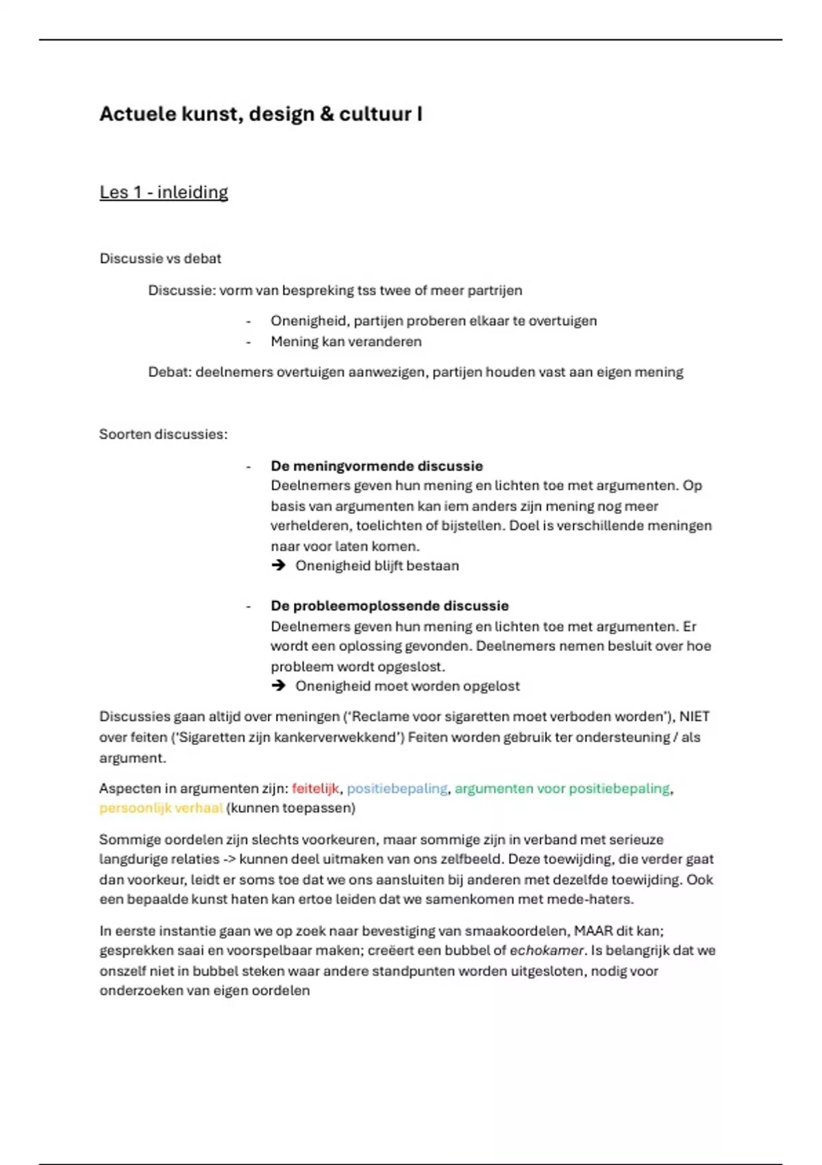 Aspecten in argumenten zijn: feitelijk, positiebepaling, argumenten voor positiebepaling,