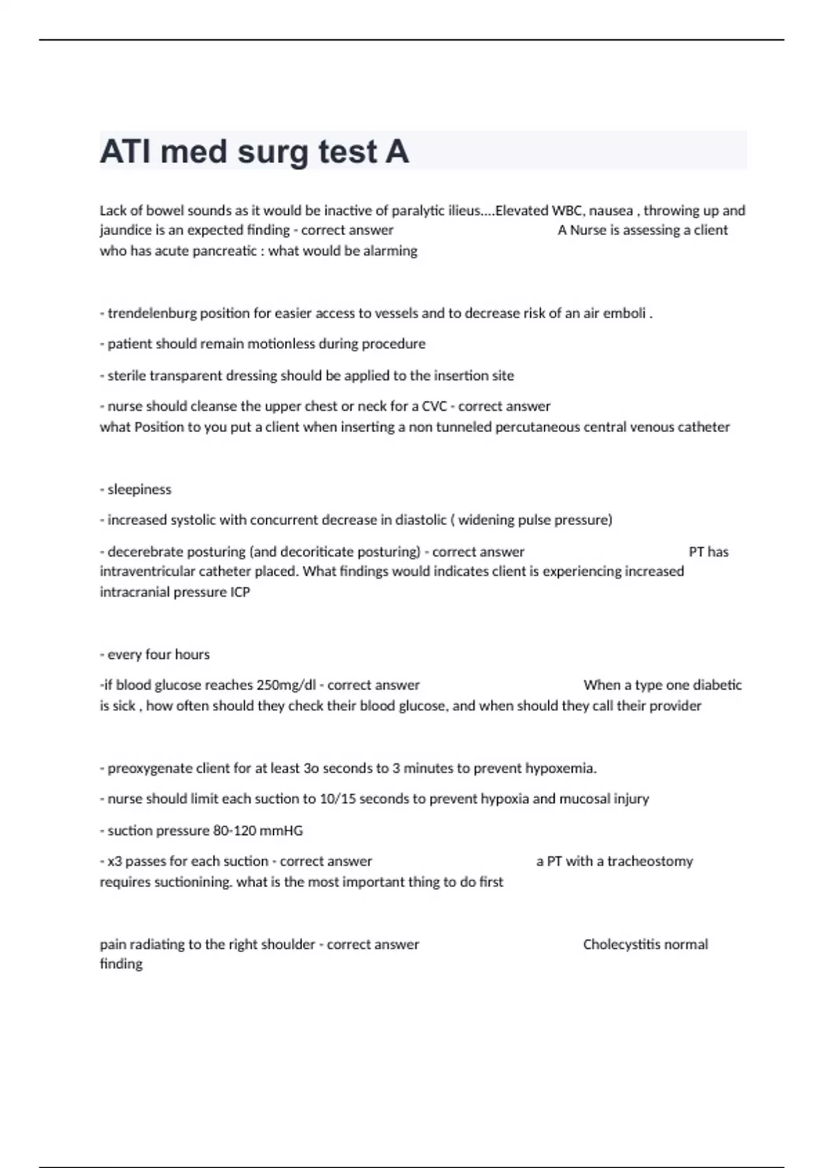 Lack of bowel sounds as it would be inactive of paralytic ilieus....Elevated WBC, nausea , throwing up and jaundice is an expected finding - correct answer A Nurse is assessing a client who has acute pancreatic : what would be alarming - trendelenburg position for easier access to vessels and to decrease risk of an air emboli . - patient should remain motionless during procedure - sterile transparent dressing should be applied to the insertion site - nurse should cleanse the upper chest or neck for a CVC - correct answer what Position to you put a client when inserting a non tunneled percutaneous central venous catheter - sleepiness - increased systolic with concurrent decrease in diastolic ( widening pulse pressure) - decerebrate posturing (and decoriticate posturing) - correct answer PT has intraventricular catheter placed. What findings would indicates client is experiencing increased intracranial pressure ICP - every four hours -if blood glucose reaches 250mg/dl - correct answer When a type one diabetic is sick , how often should they check their blood glucose, and when should they call their provider - preoxygenate client for at least 3o seconds to 3 minutes to prevent hypoxemia. - nurse should limit each suction to 10/15 seconds to prevent hypoxia and mucosal injury - suction pressure 80-120 mmHG - x3 passes for each suction - correct answer a PT with a tracheostomy requires suctionining. what is the most important thing to do first pain radiating to the right shoulder - correct answer Cholecystitis normal finding flank pain extending to the perineum - correct answer urolithiasis normal finding rigid board like abdomen - correct answer peritonitis normal finding piercing abdominal pain - correct answer pancreatitis normal finding - assess client, compare the site to the opposite extremity, looking and measuring for edema as it is an indication of infiltration, then elevate arm and maybe apply a warm compress to reduce pain, and maybe after take the IV out - correct answer PT has a saline lock on clients forearm, client reports discomfort and coolness. what is the first most appropriate action - pain in calf ;DVT - intense headache and or numbness in the arms as they are both indicative of a possible CVA - correct answer a women who is perimenopausal and is going through hormonal replacement therapy is being taught what signs to report back with ASAP, name 3 oliguria DAytime due to decreased blood flow to the kidneys - correct answer Left sided heart failure findings - jugular vein distention, dependent edema, distended abdomen - correct answer Right sided heart failure findings turn PT on side - do not push catheter further into abdomen it can cause an infection, and head of bed should be elevated - correct answer when peritoneal fluid is sluggish when draining during peritoneal dialysis what should the nurse do the facilitate the drainage - if glucose reading is less then300 mg/dl it is improving - a low ph is an expected finding - potassium levels are above the expectant range of 3.5 mEq/L - HCO3 of 14mEq/L is an expected finding - correct answer Client has DKA diabetic ketone acidosis, what are some findings - administer a mucolytic medicatin to thin secretions , such as guaifenesin, and have client sit in orthopedic position, sitting up with arms resting on the over bed table, and encourage him to drink 2/3 L/day to help thin mucous secretions - correct answer A nurse is caring for a client who has COPD and reports shortness of breath bought and fatigue with this mucus secretions what is an appropriate for client - cramping, Kkussmaul (deep labored breathing attributed to severe acidosis) respirations, increased urine output - correct answer hyperglycemia symptoms cool clammy skin - correct answer Hypoglycemia symptoms - bag should be emptied when 1/3 full - diet low in fiber - use skin barrier to protect skin from enzymes and bile salts - pt should use mild soap and water to promote healing and infection - correct answer Iliostomy patient: what to educate on chest asymmetry, lack of breath sounds on the affected side - correct answer PT is one day postop thoracotomy ( incision into thorax) what is a sign of pneumothorax -Flail chest is a life-threatening medical condition that occurs when a segment of the rib cage breaks under extreme stress and becomes detached from the rest of the chest wall - paradoxic chest movement which is the movement of the thorax on expiration and inward on inspiration - correct answer what is flail chest and a common finding - bloddy sputum that occurs with pulmonary infection and pulmonary embolism - correct answer what is hemoptysis and what is it common in -decreased viral load - an increase of T cells means increased manifestations of disease, and increased eosinophils indicates the presence of infection - correct answer Positive response to prescribed HIV medicine in Patient - a curtain being pulled over part of the viusal field, yet painless with a sudden onset, peripheral vision stays intact - correct answer retinal detachment common sensation in PT - use crutches with rubber tips to prevent slipping and decrease risk of falls - correct answer plan of care of PT with an external fixation device for a fracture of the lower extremitiys - application of heat and cold intervals - correct answer what is a non pharmacological intervention to reduce the pain in rheumatoid arthritis impulsive behavior - correct answer what is a manifestation of right hemisphere stroke anxiety , feelings of guilt, expressive aphasia - correct answer what is a manifestation of left hemisphere stroke - temperature of 38.3 or 100.9 because it could indicate an infection due to myelosuppression - correct answ