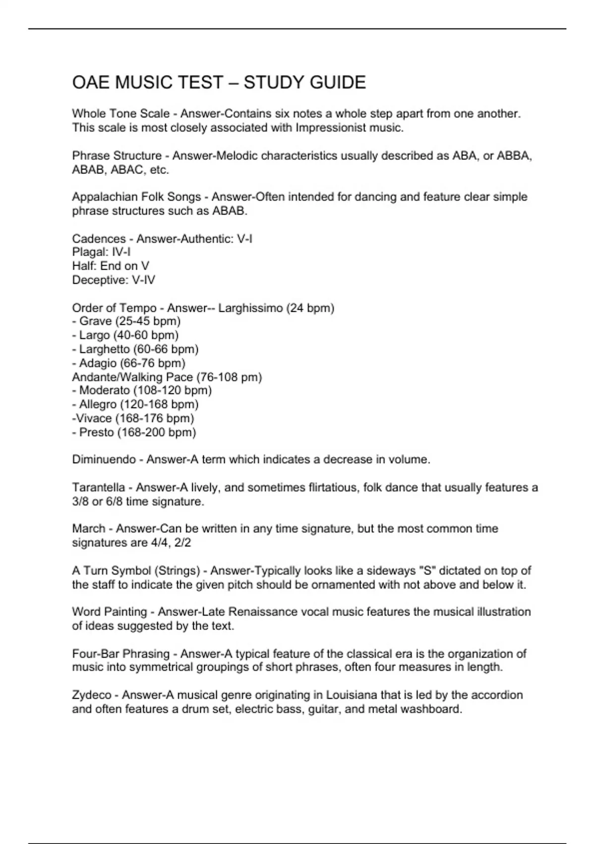 Whole Tone Scale - Answer-Contains six notes a whole step apart from one another. This scale is most closely associated with Impressionist music. Phrase Structure - Answer-Melodic characteristics usually described as ABA, or ABBA, ABAB, ABAC, etc. Appalachian Folk Songs - Answer-Often intended for dancing and feature clear simple phrase structures such as ABAB. Cadences - Answer-Authentic: V-I Plagal: IV-I Half: End on V Deceptive: V-IV Order of Tempo - Answer-- Larghissimo (24 bpm) - Grave (25-45 bpm) - Largo (40-60 bpm) - Larghetto (60-66 bpm) - Adagio (66-76 bpm) Andante/Walking Pace (76-108 pm) - Moderato (108-120 bpm) - Allegro (120-168 bpm) -Vivace (168-176 bpm) - Presto (168-200 bpm) Diminuendo - Answer-A term which indicates a decrease in volume. Tarantella - Answer-A lively, and sometimes flirtatious, folk dance that usually features a 3/8 or 6/8 time signature. March - Answer-Can be written in any time signature, but the most common time signatures are 4/4, 2/2 A Turn Symbol (Strings) - Answer-Typically looks like a sideways "S" dictated on top of the staff to indicate the given pitch should be ornamented with not above and below it.