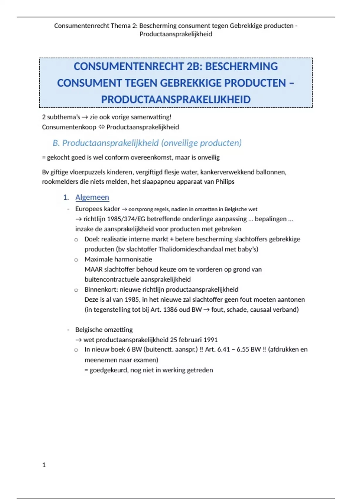 , Consumentenrecht Thema 2: Bescherming consument tegen Gebrekkige producten -