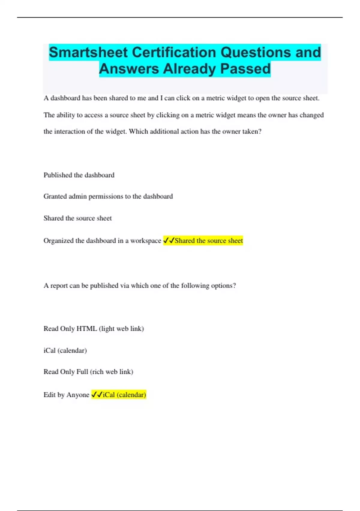 Smartsheet Certification Questions and Answers Already Passed A dashboard has been shared to me and I can click on a metric widget to open the source sheet. The ability to access a source sheet by clicking on a metric widget means the owner has changed the interaction of the widget. Which additional action has the owner taken? Published the dashboard Granted admin permissions to the dashboard Shared the source sheet Organized the dashboard in a workspace Shared the source sheet A report can be published via which one of the following options? Read Only HTML (light web link) iCal (calendar) Read Only Full (rich web link) Edit by Anyone iCal (calendar) A sheet can be exported in which of the following formats? Select ALL that apply. MS Project (XML) PDF Google sheet Excel Gantt to image (PNG) Trello MS Project (XML), PDF, Google Sheet, Excel, Gantt to image (PNG) A snapshot of a sheet or report can be shared via email using the "Send as Attachment..." action. The sheet can be sent once or on a recurring basis. Select the two file formats the attachment can be sent as. Excel PDF CSV PNG Excel and PDF Auto-fill is automatically applied by Smartsheet within every sheet. Which two of the following functions does auto-fill perform? Copy manual update requests to generate recurring updates Continue patterns of formatting Apply formulas and adjust cell references to adjacent rows Generate a numeric value based on conditional formatting rules Continue patterns of formatting Apply formulas and adjust cell references to adjacent rows Cell linking is done at which of the following levels? Row Column