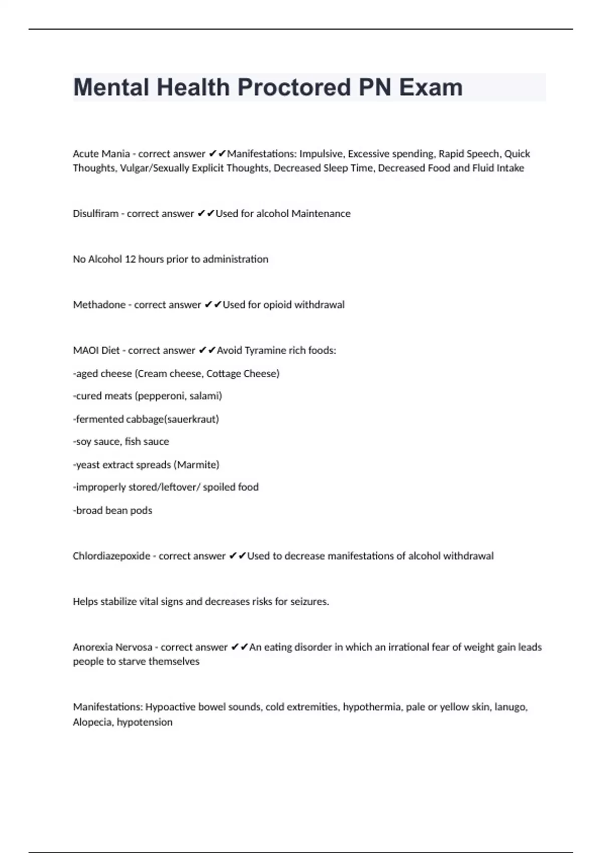 Mental Health Proctored PN ExamAcute Mania - correct answer Manifestations: Impulsive, Excessive spending, Rapid Speech, Quick Thoughts, Vulgar/Sexually Explicit Thoughts, Decreased Sleep Time, Decreased Food and Fluid Intake Disulfiram - correct answer Used for alcohol Maintenance No Alcohol 12 hours prior to administration Methadone - correct answer Used for opioid withdrawal MAOI Diet - correct answer Avoid Tyramine rich foods: -aged cheese (Cream cheese, Cottage Cheese) -cured meats (pepperoni, salami) -fermented cabbage(sauerkraut) -soy sauce, fish sauce -yeast extract spreads (Marmite) -improperly stored/leftover/ spoiled food -broad bean pods Chlordiazepoxide - correct answer Used to decrease manifestations of alcohol withdrawal Helps stabilize vital signs and decreases risks for seizures. Anorexia Nervosa - correct answer An eating disorder in which an irrational fear of weight gain leads people to starve themselves
