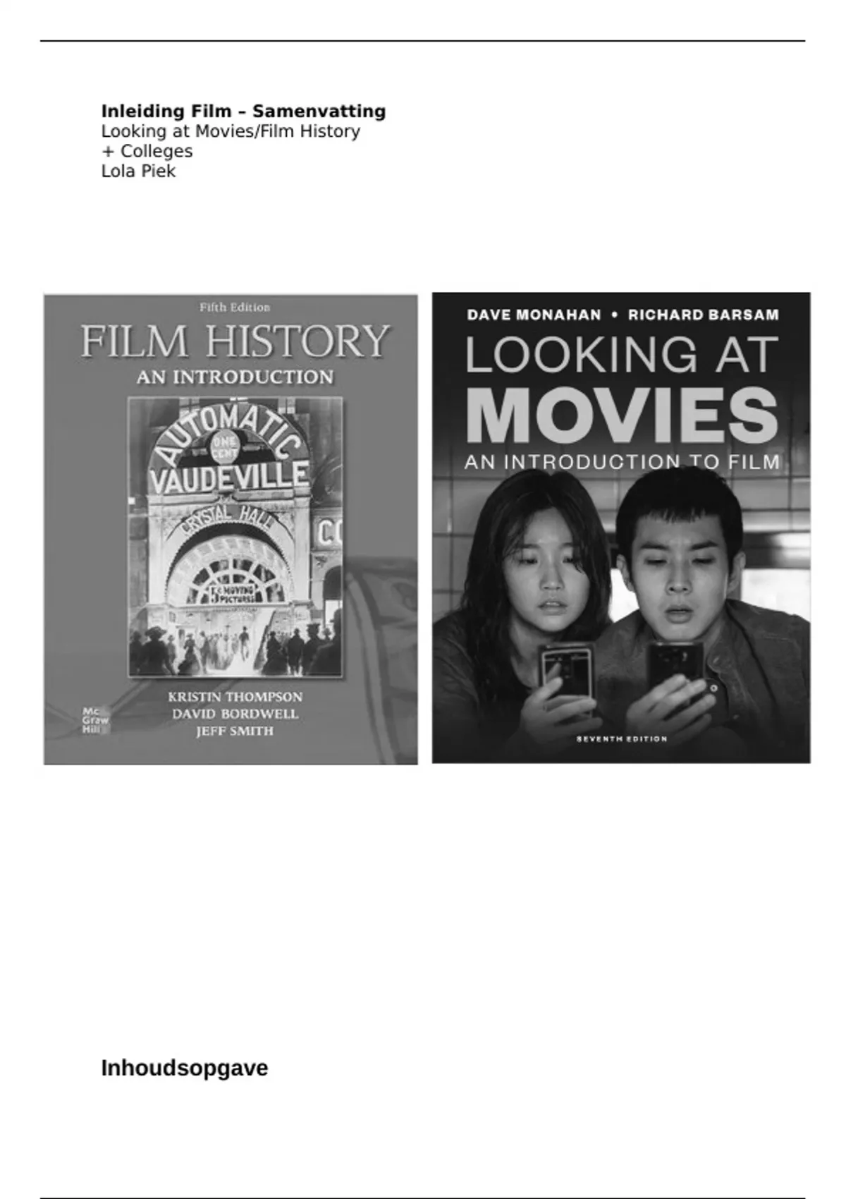 In dit document staat een samenvatting van alle benodigde hoofdstukken van de boeken 'Film History: an Introduction' en 'Looking at Movies: an Introduction to Film' ik heb mijn college aantekeningen verwerkt door de samenvatting van de boeken heen door aan te vullen bij de onderwerpen waar over gesproken werd. Voor het tentamen heb je alleen de hoofdstukken van Film History nodig maar de hoofdstukken van Looking at Movies zijn handig voor het maken van je analyse