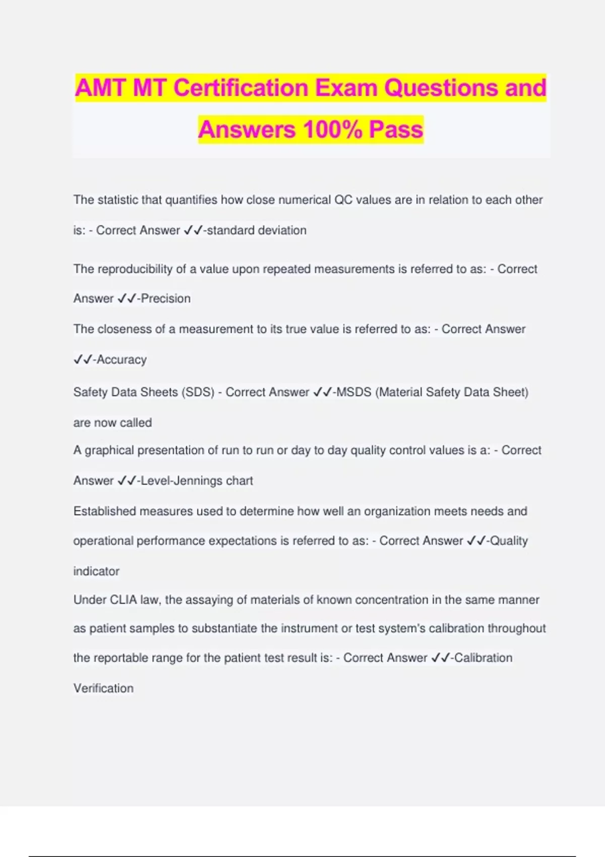 AMT MT Certification Exam Questions and Answers 100% Pass The statistic that quantifies how close numerical QC values are in relation to each other is: - Correct Answer ️️ -standard deviation The reproducibility of a value upon repeated measurements is referred to as: - Correct Answer ️️ -Precision The closeness of a measurement to its true value is referred to as: - Correct Answer ️️ -Accuracy Safety Data Sheets (SDS) - Correct Answer ️️ -MSDS (Material Safety Data Sheet) are now called A graphical presentation of run to run or day to day quality control values is a: - Correct Answer ️️ -Level-Jennings chart Established measures used to determine how well an organization meets needs and operational performance expectations is referred to as: - Correct Answer ️️ -Quality indicator Under CLIA law, the assaying of materials of known concentration in the same manner as patient samples to substantiate the instrument or test system's calibration throughout the reportable range for the patient test result is: - Correct Answer ️️ -Calibration Verification What agency determines the complexity of a lab test system? - Correct Answer ️️ - FDA (Food and Drug Administration) A substance or constituent for which the laboratory conducts testing is: - Correct Answer ️️ -Analyte Policies and procedures that are intended to promote the quality and validity of test data and ensure the reliability and integrity of data generated by analytical laboratories. - Correct Answer ️️ -Good Clinical Laboratory Practice (GCLP) Concentration of antigen (analyte) exceeds the amount of the antibody present in the reaction. - Correct Answer ️️ -Hook effect Electrophoresis support material that separates proteins on the basis of charge and molecular size - Correct Answer ️️ -polyacrylamide gel An immunoassay methodology using either europium or phyconiliproteins would use which detection method? - Correct Answer ️️ -Fluorometer Instrument that ionizes the target molecule then separates and measured the mass-to- charge ratio. - Correct Answer ️️ -Mass Spectrometer Prevents the coagulation by inhibiting coagulation. - Correct Answer ️️ -Chelation of Calcium in EDTA tube Which label used in detection of electrochemiluminescence? - Correct Answer ️️ - Ruthenium III Key membrane component for potassium selective electrode. - Correct Answer ️️ - Valinomycin POCT devices use a variety of analytical principles such as reflectance, spectrometry, fluorescence, and _________. - Correct Answer ️️ -PCR Measurement of the decrease of intensity of an incident light beam as it passes through a solution of particles defines which of the following methods? - Correct