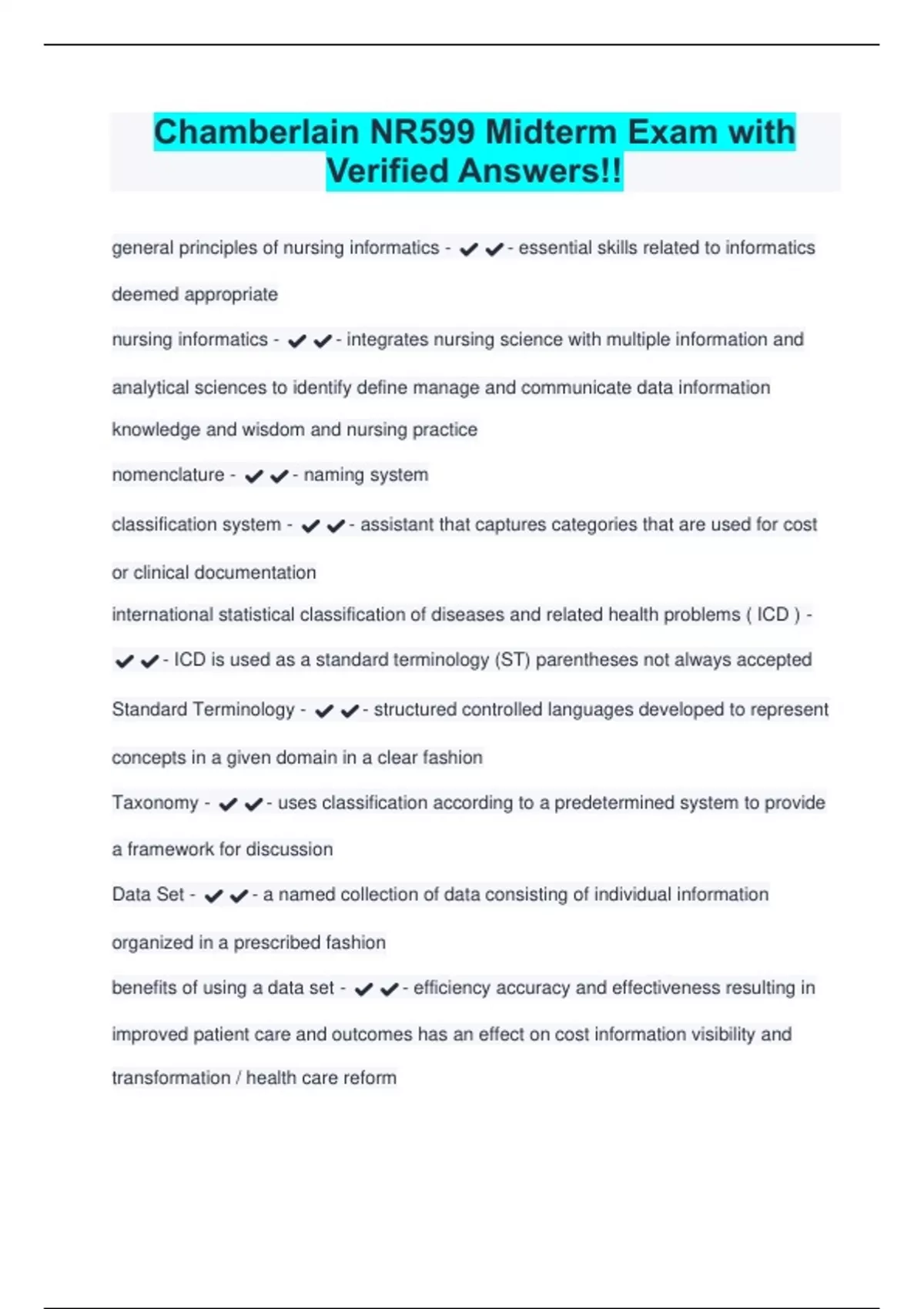 Chamberlain NR599 Midterm Exam with Verified Answers!! general principles of nursing informatics - ️️ - essential skills related to informatics deemed appropriate nursing informatics - ️️ - integrates nursing science with multiple information and analytical sciences to identify define manage and communicate data information knowledge and wisdom and nursing practice nomenclature - ️️ - naming system classification system - ️️ - assistant that captures categories that are used for cost or clinical documentation international statistical classification of diseases and related health problems ( ICD ) - ️️ - ICD is used as a standard terminology (ST) parentheses not always accepted Standard Terminology - ️️ - structured controlled languages developed to represent concepts in a given domain in a clear fashion Taxonomy - ️️ - uses classification according to a predetermined system to provide a framework for discussion Data Set - ️️ - a named collection of data consisting of individual information organized in a prescribed fashion benefits of using a data set - ️️ - efficiency accuracy and effectiveness resulting in improved patient care and outcomes has an effect on cost information visibility and transformation / health care reform knowledge - ️️ - The awareness and understanding of a set of information and ways that information can be made useful to support a specific task or arrive at a decision wisdom - ️️ - -knowledge applied in a practical way -the highest form of common sense -entails knowing when and how to apply knowledge -It is through efforts to understand the nature of knowledge in its evolution that one can conceive of build and implement informatics tools to enhance and mimic the mind's processes to facilitate decision-making and job performance scientific underpinning - ️️ - The foundation of nursing science through research data evidence and idea creation The foundation of knowledge model - ️️ - A model proposing that humans are organic information systems constantly acquiring, processing, generating, and disseminating information or knowledge in both their professional and personal lives computer science - ️️ - studies the theory underpinning information and computation and their implementation and computer systems cognitive science - ️️ - how the human mind works from an information processing perspective information science - ️️ - The retrieval and management of information as well as human computer interaction two types of informatics competencies - ️️ - 1. generalist- knowledgeable with experience 2. nurse specialist- graduate level education specialized education information literacy - ️️ - The ability to identify when information is needed as well as the skills to find evaluate ineffectively use the same information health literacy - ️️ - The degree to which individuals have the capacity to obtain, process, and understand basic health information and services needed to make appropriate health decisions meaningful use - ️️ - using technology and health information to increase the quality of care delivered patient-centered information system