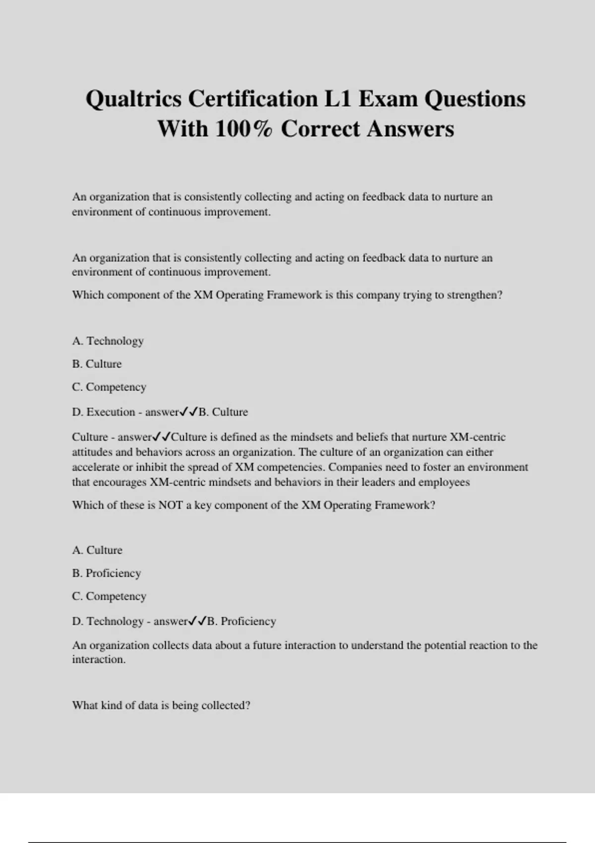 Qualtrics Certification L1 Exam Questions With 100% Correct Answers An organization that is consistently collecting and acting on feedback data to nurture an environment of continuous improvement. An organization that is consistently collecting and acting on feedback data to nurture an environment of continuous improvement. Which component of the XM Operating Framework is this company trying to strengthen? A. Technology B. Culture C. Competency D. Execution - answerB. Culture Culture - answerCulture is defined as the mindsets and beliefs that nurture XM-centric attitudes and behaviors across an organization. The culture of an organization can either accelerate or inhibit the spread of XM competencies. Companies need to foster an environment that encourages XM-centric mindsets and behaviors in their leaders and employees Which of these is NOT a key component of the XM Operating Framework? A. Culture B. Proficiency C. Competency D. Technology - answerB. Proficiency An organization collects data about a future interaction to understand the potential reaction to the interaction. What kind of data is being collected? A. Experience Expectations B. Ad Hoc Diagnostics C. Relationship Attitudes D. Choice Preferences - answerA. Experience Expectations Experience Expectations - answerExperience Expectations is how people think and feel about a future interaction with an organization, which can be collected on a regular cycle or periodically. _____ is a discipline that is used to deliver improved experiences to different stakeholders across an organization to gain competitive advantage. A. Employee Management B. Culture Management C. Customer Management D. Experience Management (XM) - answerD. Experience Management (XM) Experience Management (XM) - answerAs a discipline, XM helps organizations deliver differentiated experiences by continuously listening to feedback, propagating insights, and rapidly adapting to change. Which of the following is an example of Experience data (X data?) A. Loyalty Status B. Mobile Number C. Region D. Overall Satisfaction - answerD. Overall Satisfaction X data - answerX data is defined as data that is actively being collected from stakeholders that helps an organization understand experiences. What is an example of a positive insight organizations can gain from Experience Management? A. An organization makes a change after it is suggested by customers B. An organization becomes aware of a strength that they were not aware of and capitalizes on it