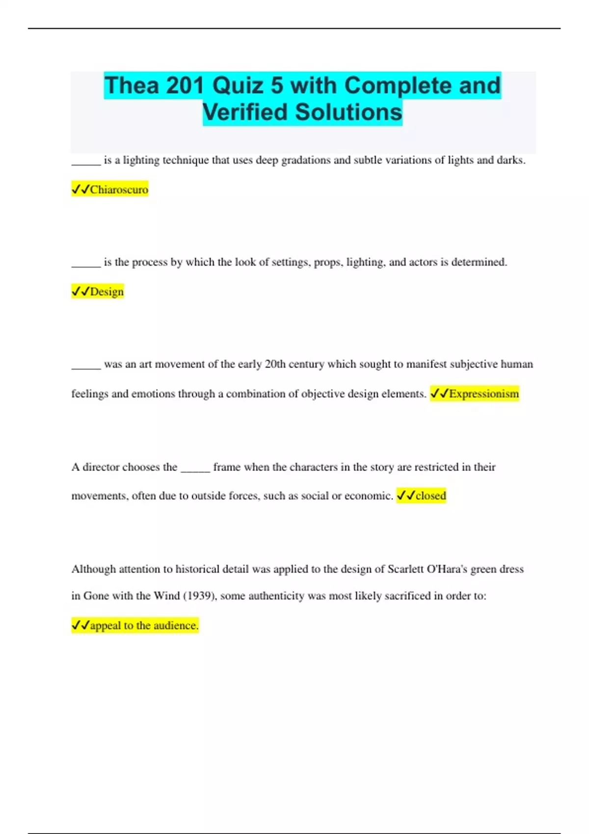 Thea 201 Quiz 5 with Complete and Verified Solutions _____ is a lighting technique that uses deep gradations and subtle variations of lights and darks. Chiaroscuro _____ is the process by which the look of settings, props, lighting, and actors is determined. Design _____ was an art movement of the early 20th century which sought to manifest subjective human feelings and emotions through a combination of objective design elements. Expressionism A director chooses the _____ frame when the characters in the story are restricted in their movements, often due to outside forces, such as social or economic. closed Although attention to historical detail was applied to the design of Scarlett O'Hara's green dress in Gone with the Wind (1939), some authenticity was most likely sacrificed in order to: appeal to the audience. Although each thing that is seen within a shot may not have a meaning in and of itself, it is the _____ of these things that provide overall meaning. combination Although facial painting and prosthetics were used for the face of the Joker in The Dark Night (2008), the transformation of Harvey Dent into Two-Face was created by _____. a process involving digital makeup Although much attention was paid to the authenticity of historical costumes during the studio era, hairstyles were often based on _____. modified contemporary looks American Beauty (1999) is the stylistic opposite of Sleepy Hollow (1999) because it employs ______. open framing and realistic settings Darren Aronofsky's movie The Black Swan (2010), about an obsessive young dancer's quest to become a great ballerina, is _____ movie. a closed Director Robert Wiene used hand-tinted colors in The Cabinet of Dr. Caligari (1920) to _____. externalize emotions During the classical Hollywood studio era, the mise-en-scène of each studio's movies was often created through _____. a predetermined formula During the first twenty years of moviemaking, directors preferred to shoot on _____ locations. Exterior During the production of a movie, light is controlled and manipulated by the _____ to achieve expressive effects. cinematographer F. W. Murneau's innovative use of _____ and subjective shots in The Last Laugh (1924) intensified the audience's involvement in onscreen events. the moving camera How did Orson Welles maintain the illusion that the