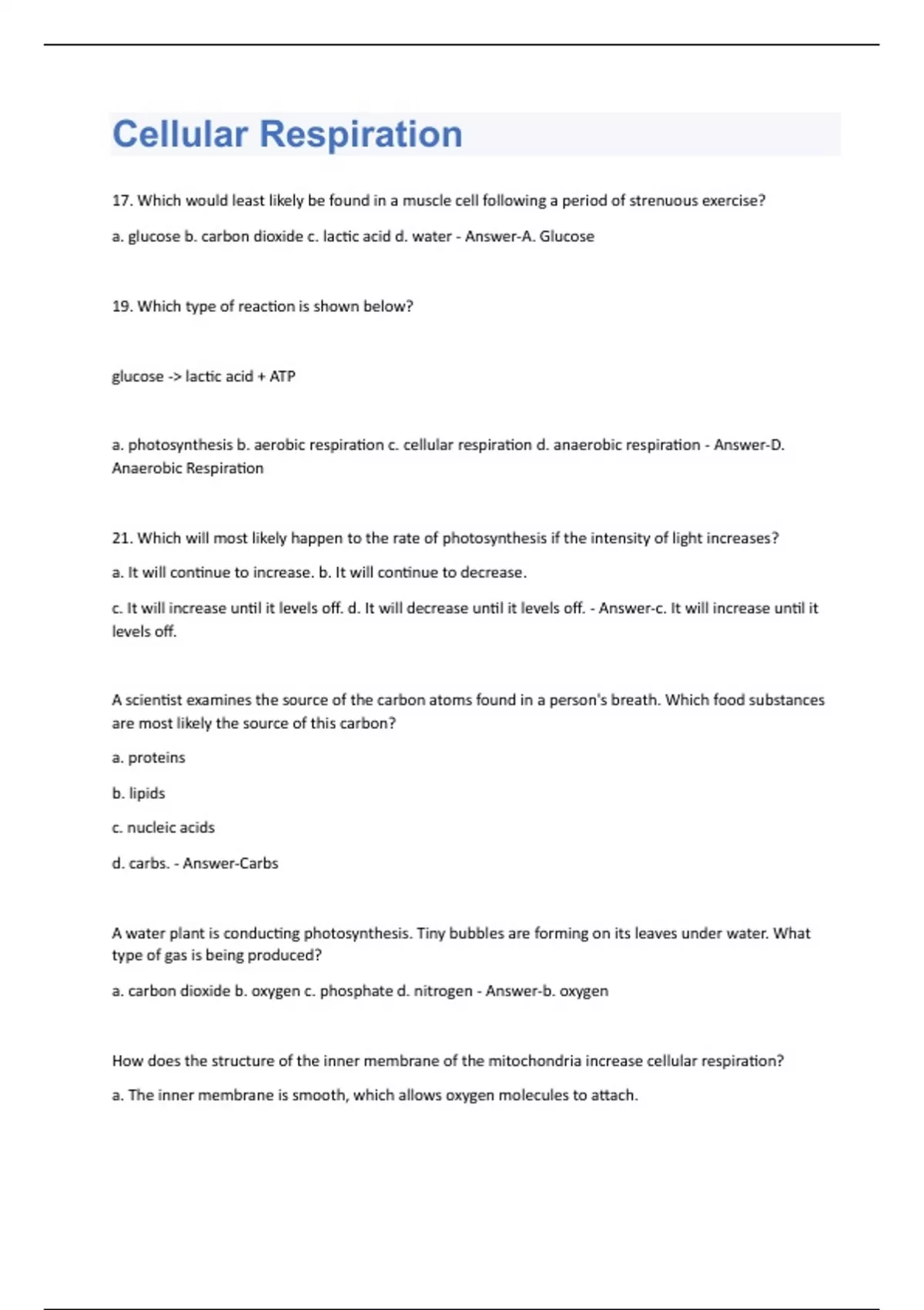 17. Which would least likely be found in a muscle cell following a period of strenuous exercise? a. glucose b. carbon dioxide c. lactic acid d. water - Answer-A. Glucose 19. Which type of reaction is shown below? glucose -> lactic acid + ATP a. photosynthesis b. aerobic respiration c. cellular respiration d. anaerobic respiration - Answer-D. Anaerobic Respiration 21. Which will most likely happen to the rate of photosynthesis if the intensity of light increases? a. It will continue to increase. b. It will continue to decrease. c. It will increase until it levels off. d. It will decrease until it levels off. - Answer-c. It will increase until it levels off. A scientist examines the source of the carbon atoms found in a person's breath. Which food substances are most likely the source of this carbon? a. proteins b. lipids c. nucleic acids d. carbs. - Answer-Carbs A water plant is conducting photosynthesis. Tiny bubbles are forming on its leaves under water. What type of gas is being produced? a. carbon dioxide b. oxygen c. phosphate d. nitrogen - Answer-b. oxygen How does the structure of the inner membrane of the mitochondria increase cellular respiration? a. The inner membrane is smooth, which allows oxygen molecules to attach.b. The inner membrane is lined with cilia, which allows respiration through the mitochondria. c. The inner membrane is folded, which increases the surface area where respiration occurs. d. The inner membrane is circular in shape, which affects the rate at which glucose is metabolized. - Answer-The inner membrane is folded, which increases the surface area where respiration occurs. How many molecules of water are needed to make one molecule of glucose, during the process of photosynthesis? a. one b. two c. six d. 10 - Answer-c. six In which compound is energy stored during photosynthesis? a. water b. oxygen c. glucose d. carbon dioxide - Answer-C. Glucose Lactic acid fermentation can occur in humans. During which activity is the production of lactic acid most likely to occur? a. resting b. light jogging c. walking d. weightlifting - Answer-D. Weightlifting Mitochondria are able to take in glucose to produce ATP, a high-energy compound. During which process is glucose converted into adenosine triphosphate (ATP)? a. photosynthesis b. chemosynthesis c. cellular digestion d. cellular respiration - Answer-Cellular Respiration