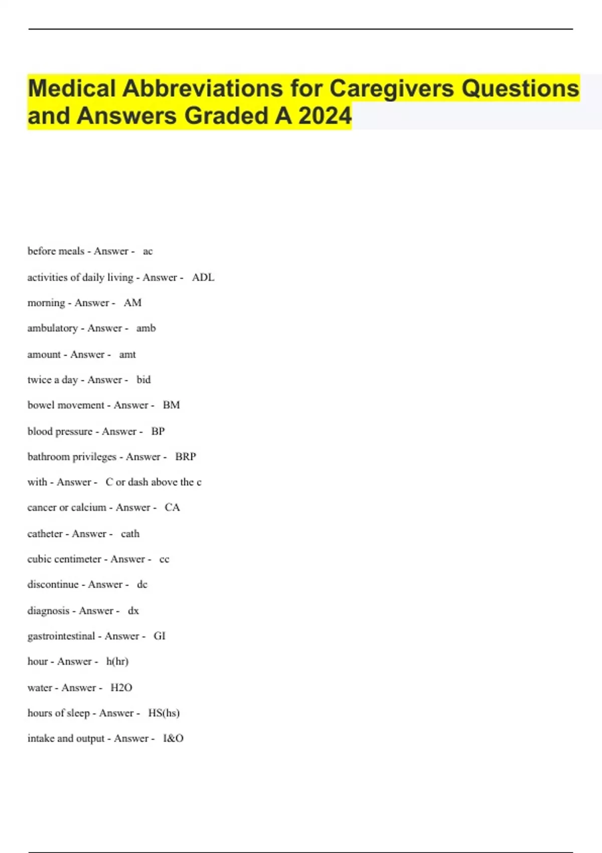 Medical Abbreviations for Caregivers Questions and Answers Graded A 2024.
