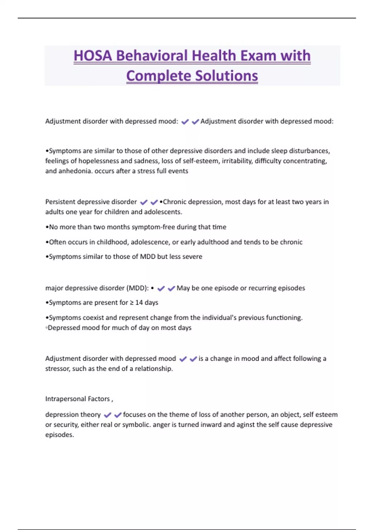 HOSA Behavioral Health Exam with Complete Solutions Adjustment disorder with depressed mood: Adjustment disorder with depressed mood: •Symptoms are similar to those of other depressive disorders and include sleep disturbances, feelings of hopelessness and sadness, loss of self-esteem, irritability, difficulty concentrating, and anhedonia. occurs after a stress full events Persistent depressive disorder •Chronic depression, most days for at least two years in adults one year for children and adolescents. •No more than two months symptom-free during that time •Often occurs in childhood, adolescence, or early adulthood and tends to be chronic •Symptoms similar to those of MDD but less severe major depressive disorder (MDD): • May be one episode or recurring episodes •Symptoms are present for ≥ 14 days •Symptoms coexist and represent change from the individual's previous functioning. ◦Depressed mood for much of day on most days Adjustment disorder with depressed mood is a change in mood and affect following a stressor, such as the end of a relationship.