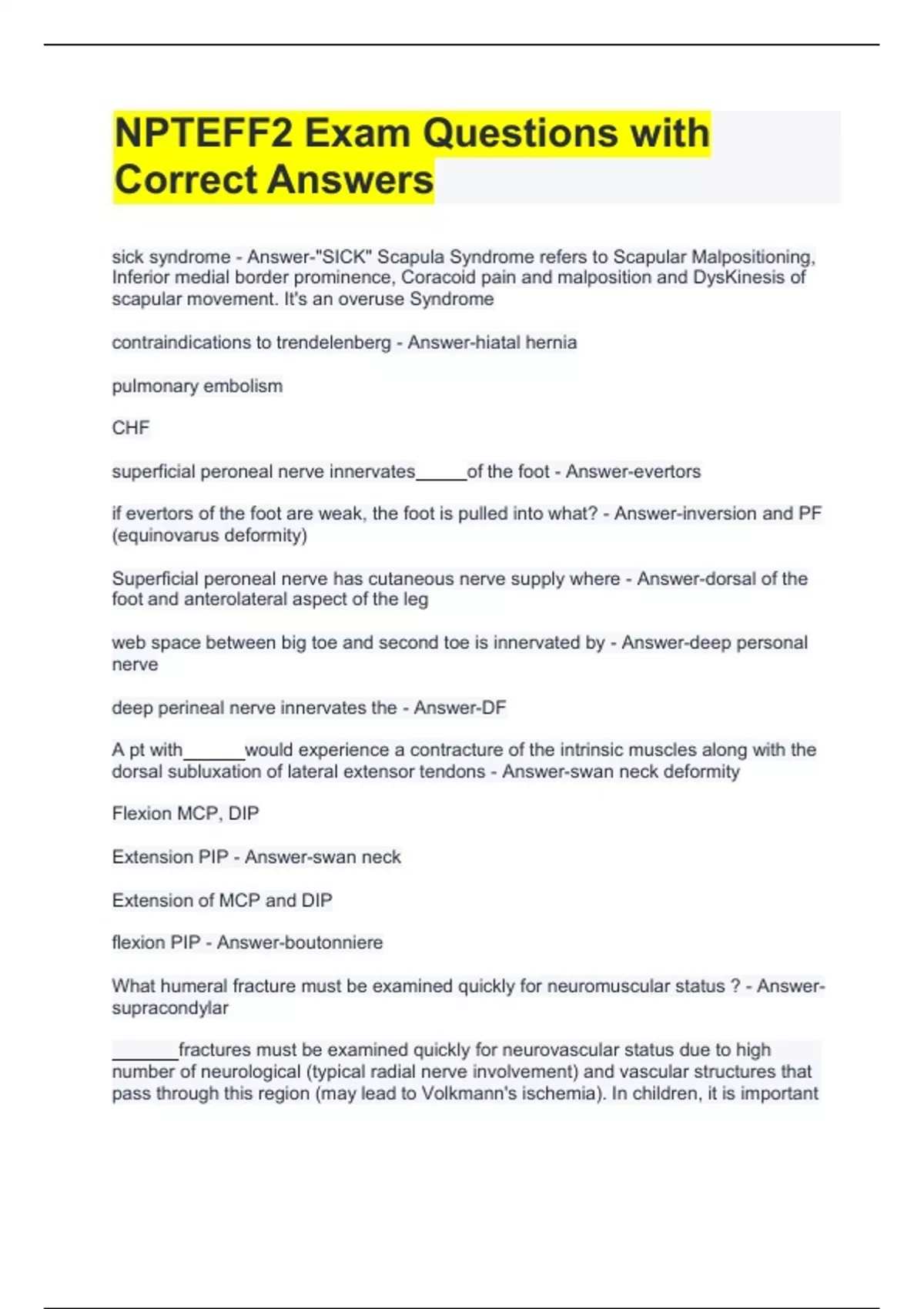 NPTEFF2 Exam Questions with Correct A sick syndrome - Answer-"SICK" Scapula Syndrome refers to Scapular Malpositioning, Inferior medial border prominence, Coracoid pain and malposition and DysKinesis of scapular movement. It's an overuse Syndrome contraindications to trendelenberg - Answer-hiatal hernia pulmonary embolism CHF superficial peroneal nerve innervates of the foot - Answer-evertors if evertors of the foot are weak, the foot is pulled into what? - Answer-inversion and PF (equinovarus deformity) Superficial peroneal nerve has cutaneous nerve supply where - Answer-dorsal of the foot and anterolateral aspect of the leg web space between big toe and second toe is innervated by - Answer-deep personal nerve deep perineal nerve innervates the - Answer-DF A pt with would experience a contracture of the intrinsic muscles along with the dorsal subluxation of lateral extensor tendons - Answer-swan neck deformity Flexion MCP, DIP Extension PIP - Answer-swan neck Extension of MCP and DIP flexion PIP - Answer-boutonniere What humeral fracture must be examined quickly for neuromuscular status ? - Answer- supracondylar to assess growth plate as well as these fractures have a high incidence of malunion - Answer-Supracondylar Causes of ITB friction syndrome in bikers - Answer-excessive bike seat height cleats ER on the pedal (tibia IR resulting in a valgus force on the knee) adrenal insufficiency leads to a decrease in - Answer-cortisol and aldosterone lack of cortisol can lead to the patient developing what disease - Answer-addison's Addison's disease causes and - Answer-hypoglycemia and hypotension syncope or fainting spells can commonly occur in its with disease - Answer- addison's aldosterone is responsible for rentension - Answer-sodium these symptoms are expected in disease hyponatremia hypoglycemia syncope hypotension fatigue muscle weakness - Answer-Addison's disease Pelvic drop on L side when pt is standing on R leg. MMT for hip abduction is 2+ on the weaker LE Correct placement, spacing and sensitivity of electrodes to initiate the biofeedback - Answer-place on R glut med Widely spaced High sensitivity Biofeedback for tight/spasm muscle - Answer-close together low sensitivity Can a PTA write progress notes? - Answer-no Can PTA set new goals? - Answer-No can PTA change the POC - Answer-no Can PTA re-evaluate - Answer-no Can PTA document changes in the daily note - Answer-yes a pneumothorax pushes the trachea to the - Answer-contralateral side massive atelectasis will pull the trachea to the - Answer-ipsilateral side Stage as the patient doesn't experience any changes of swelling during arm elevation and initial signs of fibrotic changes are present during this stage. Lymphedema - Answer-2 Stage is reversible lymphedema and elevation of the arm will reduce swelling - Answer-1 Stage is lymphostatic elephantiasis, hardening of dermal tissues, papilloma's of the skin will be noticed - Answer-3 Stage patient begins to feel heaviness in limbs. - Answer-0 (preclinical stage), is pregnancy induced hypertension and is an absolute contraindication to exercise during pregnancy. - Answer-Pre-eclampsia For diagnostic purposes, what is the recommended number of chest radiographs to be performed on a patient when standard radiographs are ordered for a patient with suspected pulmonary pathologies? - Answer-2 radiographs, in a posterior-anterior standing view and a left lateral view (unless the pathology is suspected on the right side) is breathlessness or SOB caused with sitting, which is relieved on lying down in supine position - Answer-Platypnea Patients with CHF generally have , which is difficulty breathing while lying supine and relieved when sitting up. - Answer-orthopnea Symptoms of: edema, ascites, frothy sputum, orthopnea - Answer-CHF hydrotherapy to strengthen LE, how can they increase resistance to knee movements? - Answer-add paddles for the feet Patients usually present with dyspnea on exertion that becomes progressive. They may develop nonspecific chest discomfort; sometimes the chest pain is pleuritic, which is a sharp, stabbing pain exacerbated by coughing or breathing that changes with position. Other symptoms characteristic of the underlying cause of pleural effusion may be the primary clinical picture (e.g., weight loss and fever with TB or cancer or signs of heart failure). Tachycardia, distant heart sounds, fixed jugular venous distention, edema of the extremities, and a paradoxical pulse may also be observed. - Answer-Pleural effusion Treatment force of lumbar traction for disc protrusion is - Answer-25 percent BWT in prone position Traction For joint distraction it is . - Answer-50 percent BWT in prone causes flattened or inverted T waves in the ECG. - Answer-Hypokalemia are diuretics which can cause excessive loss of what? - Answer-potassium leading to hypokalemia eyes open to pain incomprehensible sounds no movement in limbs in response to pain - Answer-eyes to pain: 2 incomprehensible sounds: 2 no movement: 1 =5/15 A Physical Therapist is educating a Physical Therapy Student on special tests and states that if the test result is negative then you can be certain the patient does not have the condition. Which of the following diagnostic characteristics MOST closely aligns with this description - Answer-Sensitivity IV/EV occur at the joint - Answer-subtalar medial glide at the subtalar joint improves what - Answer-eversion During which of the following three phases of gait will 0 degrees of knee extension be MOST beneficial for? - Answer-IC, end of terminal stance, end of terminal swing CRPS type with a confirmed nerve injury - Answer-2 CRPS type without a confirmed nerve injury - Answer-1 is associated with contralateral hemiparesis of face and extremities and ipsilateral nystagmus. - Answer-Medial inferior pontine syndrome if there is a lesion to CN medial strabismus of ipsilateral eye is observed - Answer-6 Patient presents with a hyperlordotic curve, retracted bilateral shou