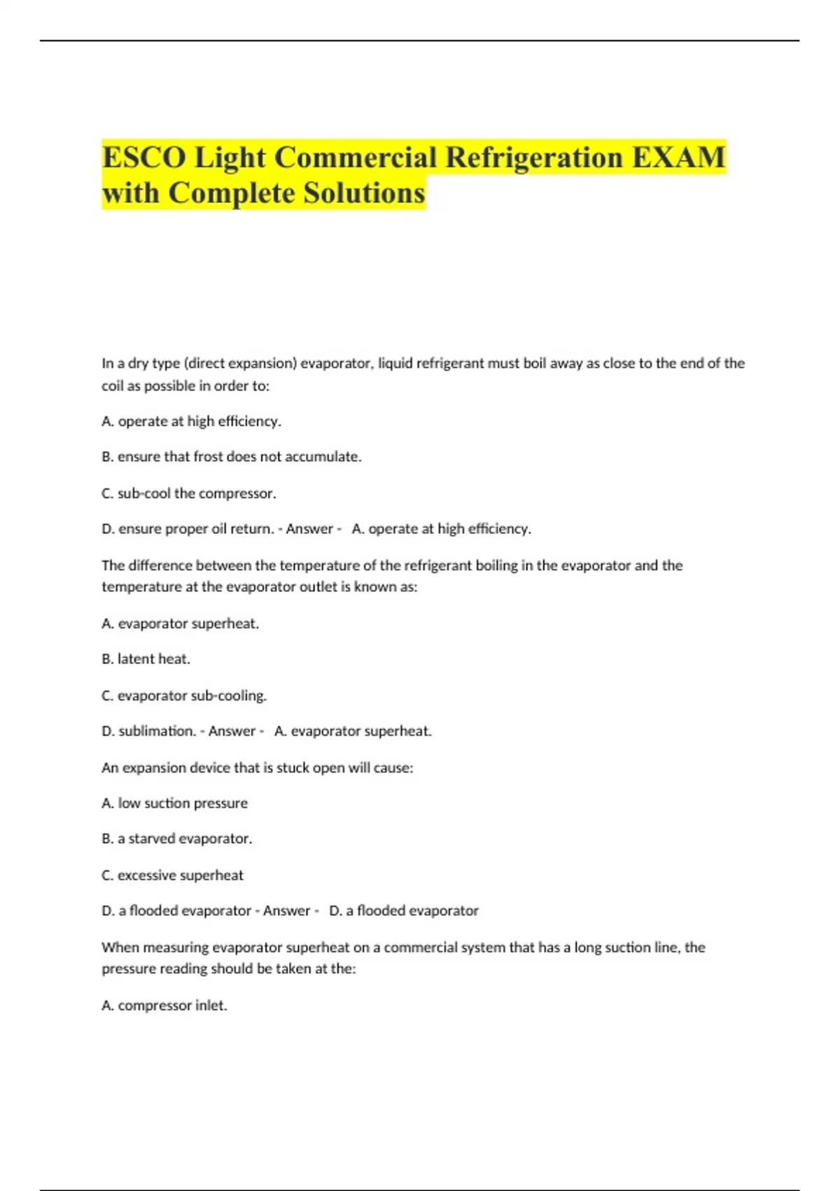ESCO Light Commercial Refrigeration EXAM with Complete Solutions.