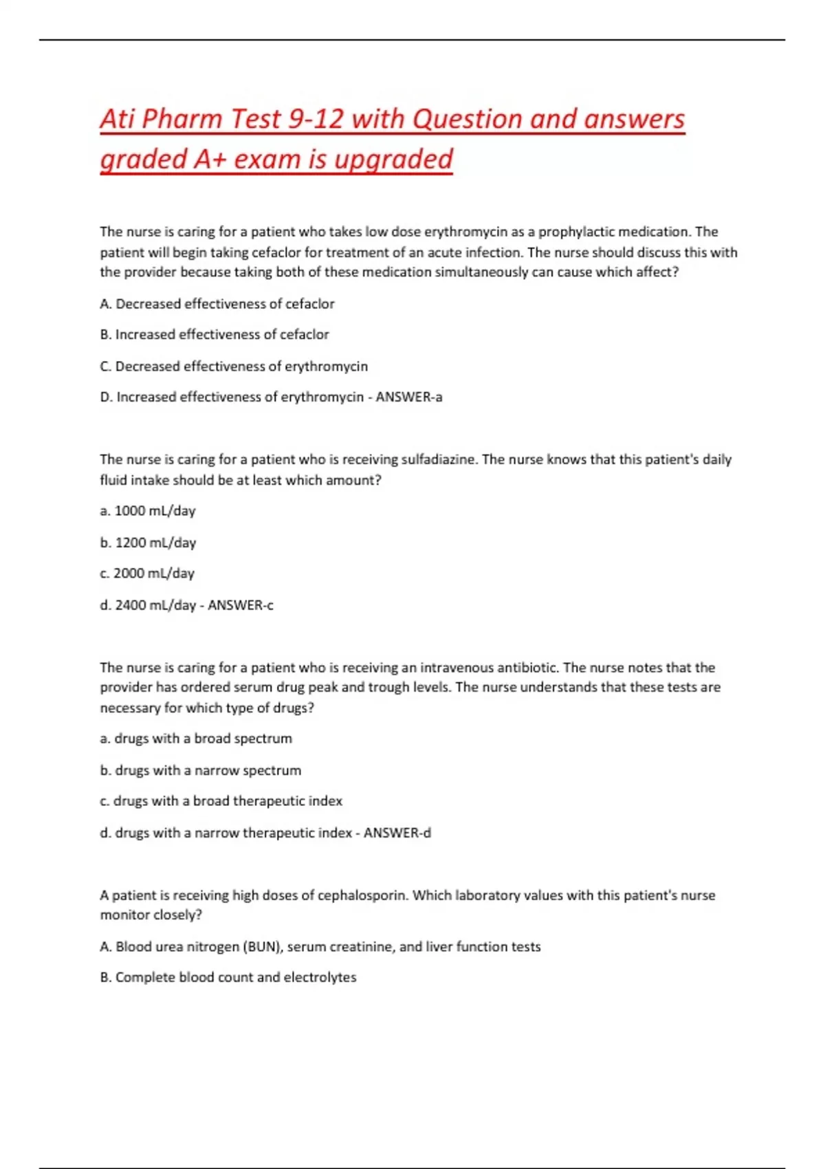 The nurse is caring for a patient who takes low dose erythromycin as a prophylactic medication. The patient will begin taking cefaclor for treatment of an acute infection. The nurse should discuss this with the provider because taking both of these medication simultaneously can cause which affect? A. Decreased effectiveness of cefaclor B. Increased effectiveness of cefaclor C. Decreased effectiveness of erythromycin D. Increased effectiveness of erythromycin - ANSWER-a The nurse is caring for a patient who is receiving sulfadiazine. The nurse knows that this patient's daily fluid intake should be at least which amount? a. 1000 mL/day b. 1200 mL/day c. 2000 mL/day d. 2400 mL/day - ANSWER-c The nurse is caring for a patient who is receiving an intravenous antibiotic. The nurse notes that the provider has ordered serum drug peak and trough levels. The nurse understands that these tests are necessary for which type of drugs? a. drugs with a broad spectrum b. drugs with a narrow spectrum c. drugs with a broad therapeutic index d. drugs with a narrow therapeutic index - ANSWER-d A patient is receiving high doses of cephalosporin. Which laboratory values with this patient's nurse monitor closely? A. Blood urea nitrogen (BUN), serum creatinine, and liver function tests B. Complete blood count and electrolytes C. Serum calcium and magnesium D. Serum glucose and lipid's - ANSWER-a A patient is diagnosed with mycoplasma pneumonia. Which antibiotic will the nurse expect the provider to order to treat this infection? a. Azithromycin (Zithromax) b. Clarithromycin (Biaxin) c. Erythromycin (E-Mycin) d. Fidaxomicin (Dificid) - ANSWER-c The nurse assumes care for a patient who is currently receiving a dose of intravenous vancomycin (Vancocin) infusing at 20 mg/min. The nurse notes red blotches on the patient's face, neck, and chest and assesses a blood pressure of 80/55 mm Hg. Which action will the nurse take? a. Request an order for IV epinephrine to treat anaphylactic shock. b. Slow the infusion to 10 mg/min and observe the patient closely. c. Stop the infusion and obtain an order for a BUN and serum creatinine. d. Supect Stevens-Johnson syndrome and notify the provider immediately. - ANSWER-b The nurse is preparing to give a dose of oral clindamycin (Cleocin) to a patient who is being treated for a skin infection caused by Staphylococcus aureus. The patient has had several doses of the medication and reports having nausea. Which action will the nurse take next? a. Administer the next dose when the patient has an empty stomach. b. Hold the next dose and contact the patient's provider. c. Instruct the patient to take the next dose with a full glass of water. d. Request an order for an antacid to give along with the next dose. - ANSWER-c The nurse is preparing to give a dose of a cephalosporin medication to a patient who has been receiving the antibiotic for 2 weeks. The nurse notes ulcers on the patients tongue and buccal mucosa. Which action will the nurse take? a. Hold the drug and notify the provider. b. Obtain an order to culture the oral lesions. c. Gather emergency equipment to prepare for anaphylaxis. d. Report a possible superinfection side effect of the cephalosporin. - ANSWER-d The nurse caring for a patient who will receive penicillin to treat an infection asks the patient about previous drug reactions. The patient reports having had a rash when taking amoxicillin (Amoxil). The nurse will contact the provider to a. discuss giving a smaller dose of penicillin. b. discuss using erythromycin (E-mycin) instead of penicillin. c. request an order for diphenhydramine (Benadryl). d. suggest that the patient receive cefuroxime (Ceftin). - ANSWER-b A patient who will begin taking trimethoprim-sulfamethoxazole TMP-SMX asks the nurse why the combination drug is necessary. The nurse will explain that the combination is used to a. broaden the antibacterial spectrum. b. decrease bacterial resistance. c. improve the taste. d. minimize toxic effects. - ANSWER-b The nurse is caring for several patients who are receiving antibiotics. Which order will the nurse question? a. Azithromycin (Zithromax) 500 mg IV in 500 mL fluid b. Azithromycin (Zithromax) 500 mg PO once daily c. Erythromycin 300 mg IM QID d. Erythromycin 300 mg PO QID - ANSWER-c The nurse is preparing to administer an antibiotic to a patient who has been receiving the antibiotic for 2 days after a culture was obtained. The nurse notes increased erythema and swelling, and the patient has a persistent high fever of 39 C. What is the nurses next action? a. Administer the antibiotic as ordered. b. Contact the provider to request another culture. c. Discuss the need to add a second antibiotic with the provider. d. Review the sensitivity results from the patients culture. - ANSWER-d The nurse is preparing to administer clarithromycin to a patient. When performing a medication history, the nurse learns that the patient takes warfarin to treat atrial fibrillation. The nurse will perform which action? a. Ask the provider if azithromycin may be used instead of clarithromycin. b. Obtain an order for continuous cardiovascular monitoring.
