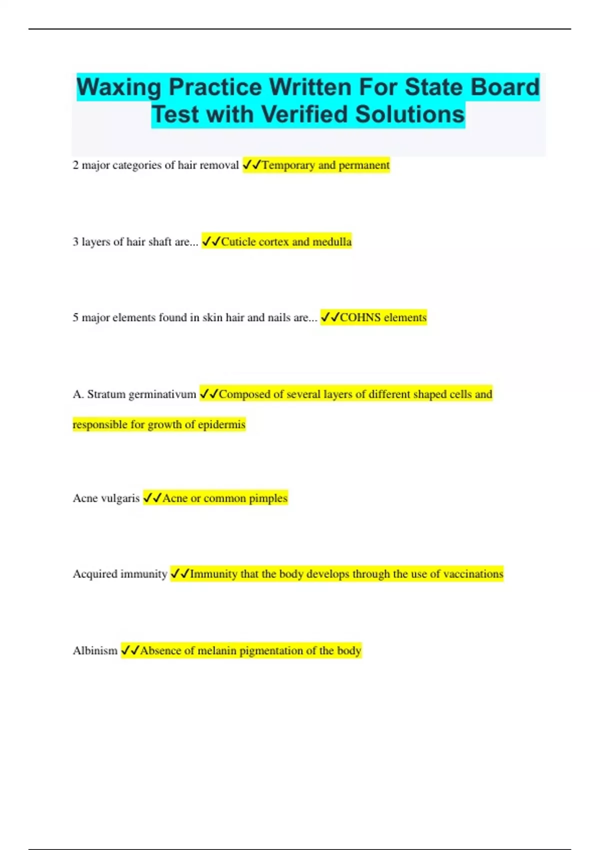 Waxing Practice Written For State Board Test with Verified Solutions 2 major categories of hair removal Temporary and permanent 3 layers of hair shaft are... Cuticle cortex and medulla 5 major elements found in skin hair and nails are... COHNS elements A. Stratum germinativum Composed of several layers of different shaped cells and responsible for growth of epidermis Acne vulgaris Acne or common pimples Acquired immunity Immunity that the body develops through the use of vaccinations Albinism Absence of melanin pigmentation of the body Alternating current Rapid and interrupted current that flows in one direction and then in the opposite direction Amp Term used to measure the strength of an electric current Anagen, catagen, and telogen 3 stages of hair growth Anode Postive electrode Antiseptic lotion Avoid infection sponge a tweezer are frequently with cotton moistened with this Arrestor pili Tiny involuntary muscle fiber in the base of the hair follicle Arrestor pili muscle Responsible for goosebumps Bacteria One-celled microorganism with both plant and animal characteristics Bacteria are so small you have to use what to see them? Microscope Basal cell carcinoma Most common type of skin cancer caused by overexposure to the sun Beeswax Wax that has a high incidence of allergic reactions and may require a patch test is... Bloodborne pathogens Disease causing bacteria or viruses that are carried through the body in the blood or body fluids Borders American Cancer Society uses the letter b in a way to recognize potential skin cancer from a mole Callus Caused by continued pressure on