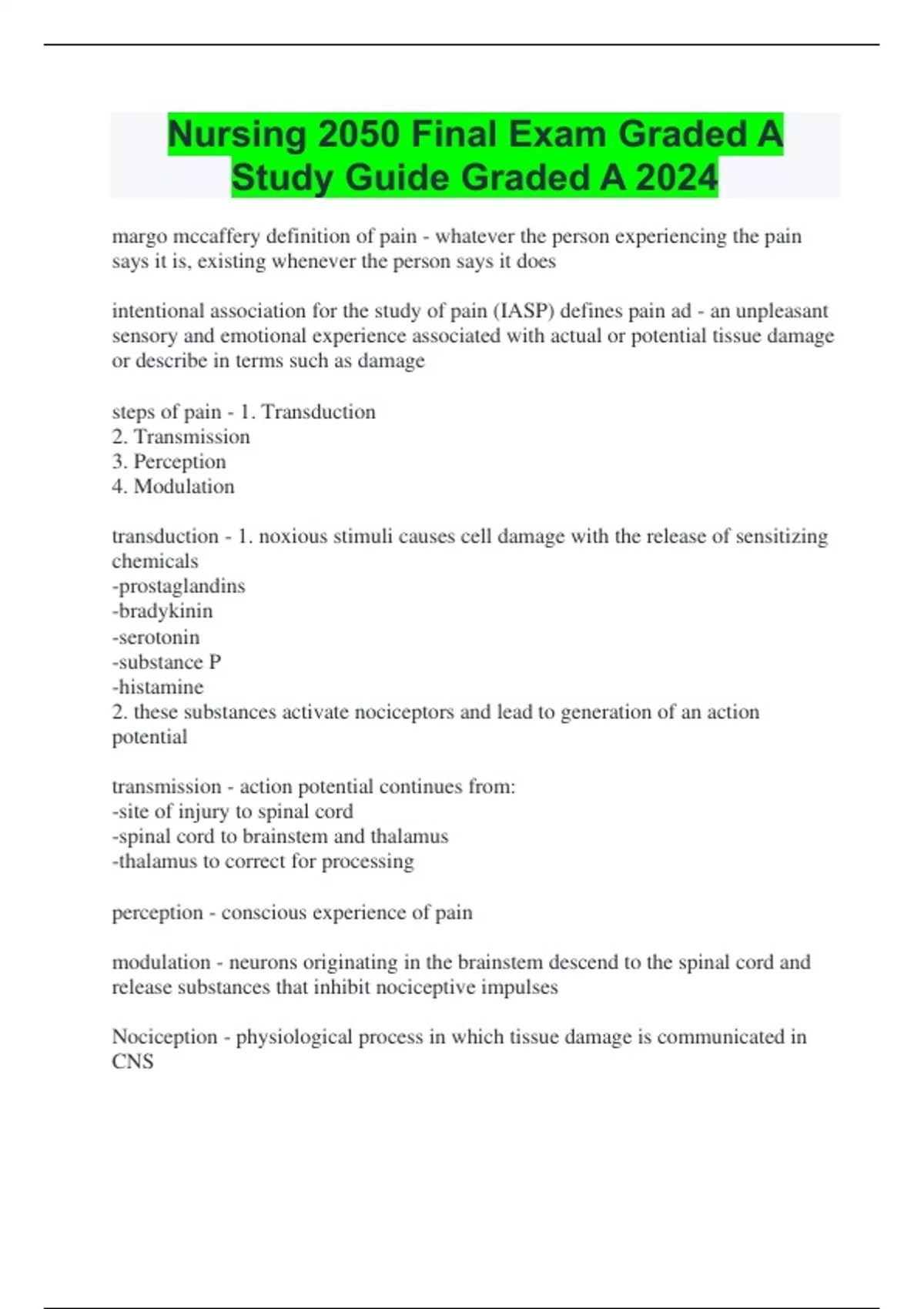 margo mccaffery definition of pain - whatever the person experiencing the pain says it is, existing whenever the person says it does intentional association for the study of pain (IASP) defines pain ad - an unpleasant sensory and emotional experience associated with actual or potential tissue damage or describe in terms such as damage steps of pain - 1. Transduction 2. Transmission 3. Perception 4. Modulation transduction - 1. noxious stimuli causes cell damage with the release of sensitizing chemicals -prostaglandins -bradykinin -serotonin -substance P -histamine 2. these substances activate nociceptors and lead to generation of an action potential transmission - action potential continues from: -site of injury to spinal cord -spinal cord to brainstem and thalamus -thalamus to correct for processing perception - conscious experience of pain modulation - neurons originating in the brainstem descend to the spinal cord and release substances that inhibit nociceptive impulses Nociception - physiological process in which tissue damage is communicated in CNS consequences of untreated pain - -increased morbidity -respiratory dysfunction -increased HR and cardiac workload -increased muscle contractions and spasm -decreased DI motility and transit and increased catabolism -unnecessary suffering -psychosocial dysfunction -impaired recovery from acute illness emotional responses to pain - -anger -fear -anxiety -depression types of pain - nociceptive and neuropathic nociceptive pain - -caused by damage to the somatic or visceral tissue -deep aching, or throbbing well localized from bone joint muscle skin or connective tissue -visceral pain involvement or obstruction of internal organs intestine and bladder surgical incision neuropathic pain - -damage to peripheral nerves CNS -trauma inflammation -numbing, burning, shooting, stabbing, lingering acute pain - -sudden -3 months or as long as it takes for normal healing to occur -mild ro severe -generally can identify a precipitating event or illness (illness or surgery) -decrease over time and goes away as recovery occurs chronic pain - -gradual or sudden -3 months; may start as acute injury or event but continues past the normal time of recovery -mild to severe -may not be known; original cause of pain may differ from mechanism that maintains the pain -typically pain does not go away; characterized by periods of waxing and waning manifestations of acute pain - may reflect SNS activation -increase HR, respiratory rate, BP -diaphoresis/pallor -anxiety, agitation, confusion -urine retention goal of acute pain - control with eventual elimination chronic pain manifestations - predominantly behavioral -flat affect -decreased physical movement/activity -fatigue -withdrawal from others and social interaction goal of chronic pain management - pain control to the extent possible, focus on enhancing function and quality of life wong baker face scale - Used for small children with pain FLACC pain rating scale - Face Legs Activity Cry Consolability Rate 0-2 in all categories, goes up to 10 points pain assessment - Onset Location Duration Characteristics Aggravating Relieves Treatment referred pain - pain that is felt in a location other than where the pain originates treatment of pain - -depends on the type of pain -treat the underlying cause of pain -non-pharmacological and pharmacological
