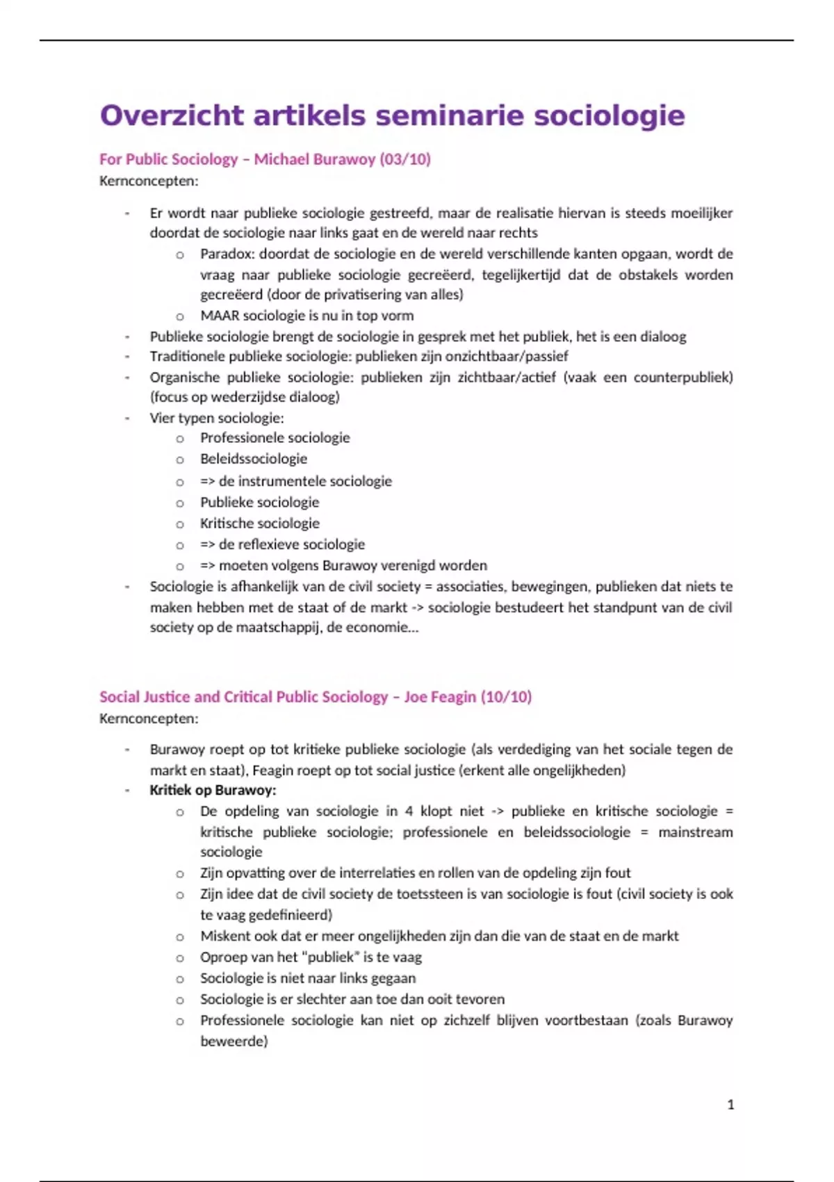 , - Publieke sociologie is inherent kritiek (dus geen opdeling) en is betrokken tot social justice