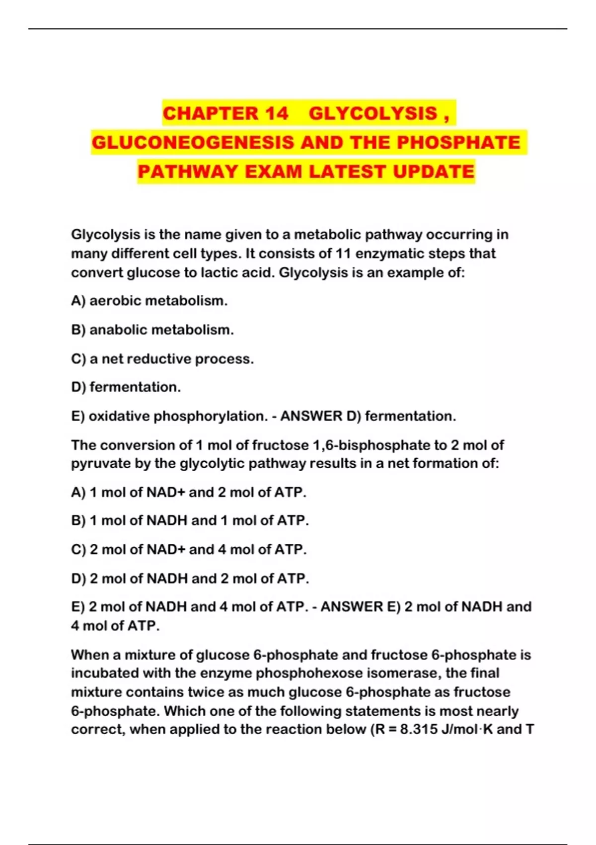 CHAPTER 14 GLYCOLYSIS , GLUCONEOGENESIS AND THE PHOSPHATE PATHWAY EXAM LATEST UPDATE....