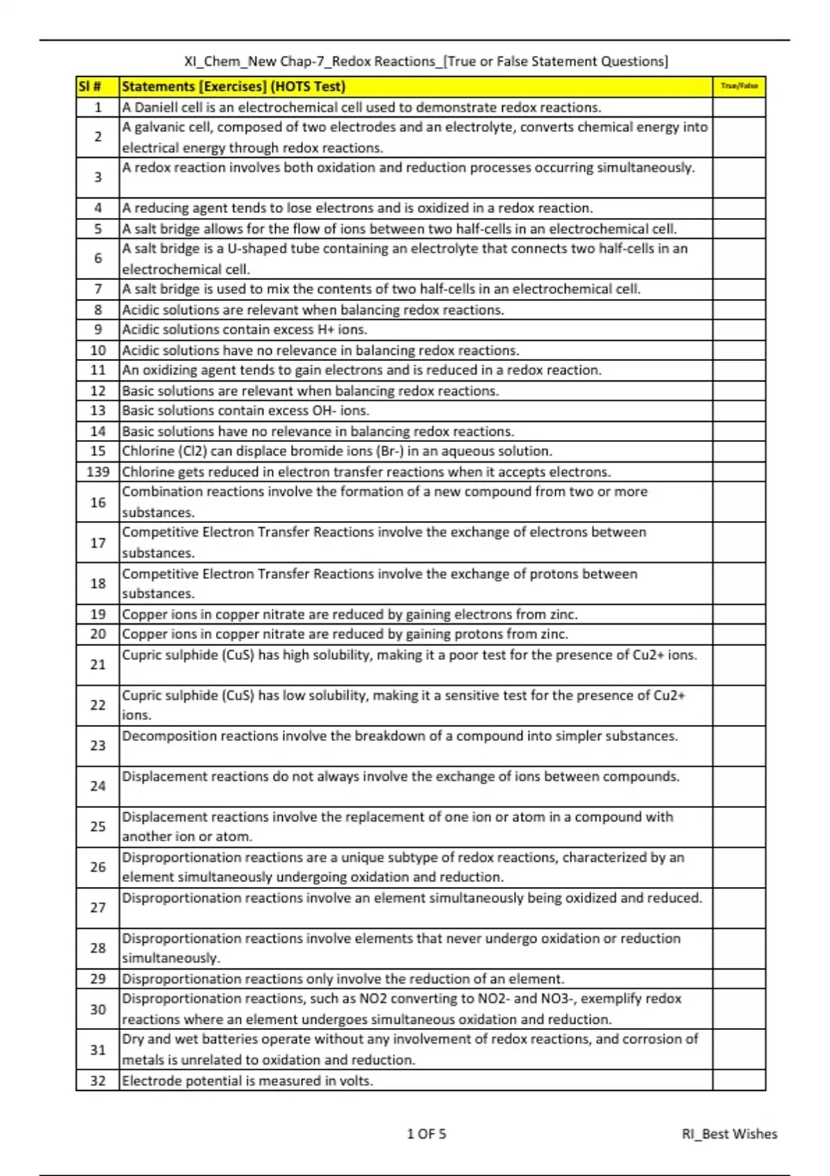 , XI_Chem_New Chap-7_Redox Reactions_[True or False Statement Questions]