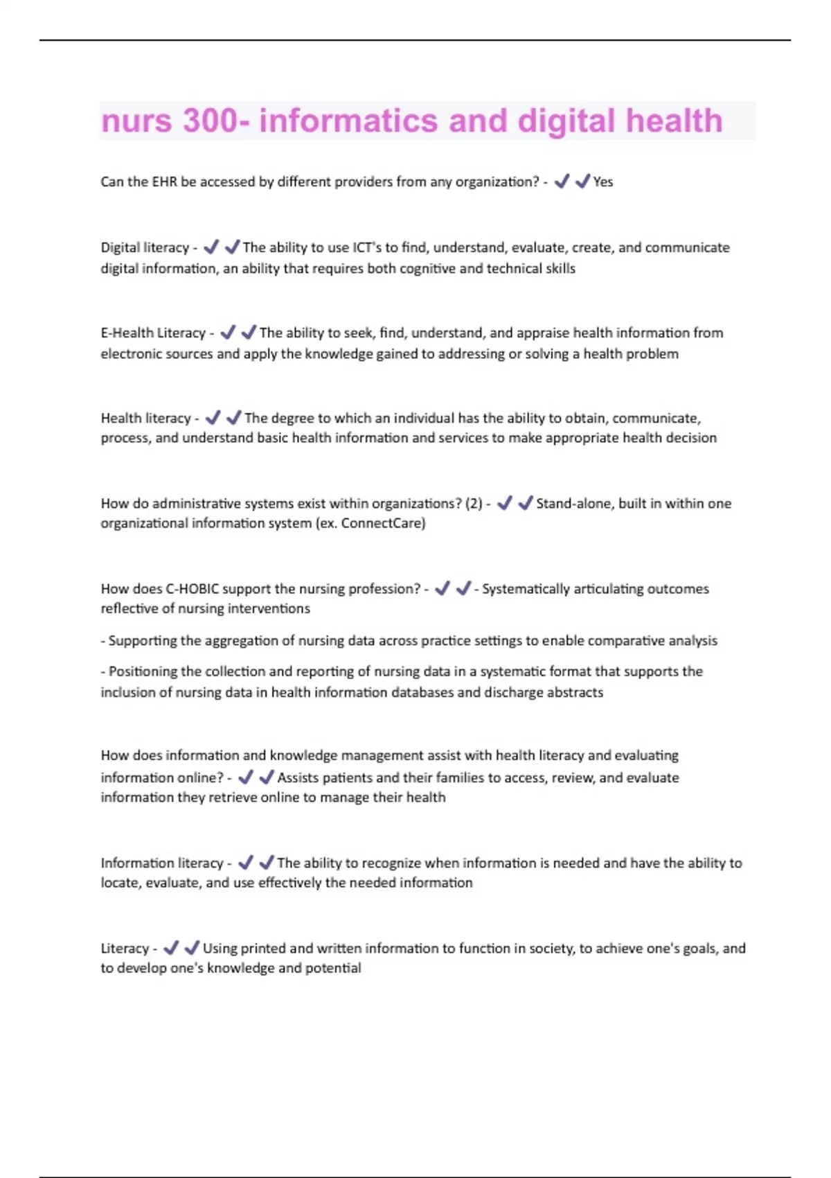 Can the EHR be accessed by different providers from any organization? - Yes Digital literacy - The ability to use ICT's to find, understand, evaluate, create, and communicate digital information, an ability that requires both cognitive and technical skills E-Health Literacy - The ability to seek, find, understand, and appraise health information from electronic sources and apply the knowledge gained to addressing or solving a health problem Health literacy - The degree to which an individual has the ability to obtain, communicate, process, and understand basic health information and services to make appropriate health decision How do administrative systems exist within organizations? (2) - Stand-alone, built in within one organizational information system (ex. ConnectCare) How does C-HOBIC support the nursing profession? - - Systematically articulating outcomes reflective of nursing interventions - Supporting the aggregation of nursing data across practice settings to enable comparative analysis - Positioning the collection and reporting of nursing data in a systematic format that supports the inclusion of nursing data in health information databases and discharge abstracts How does information and knowledge management assist with health literacy and evaluating information online? - Assists patients and their families to access, review, and evaluate information they retrieve online to manage their health Information literacy - The ability to recognize when information is needed and have the ability to locate, evaluate, and use effectively the needed information Literacy - Using printed and written information to function in society, to achieve one's goals, and to develop one's knowledge and potentialPLEASED - Evaluation of Information Found on the Internet - P - Purpose of site creation L - Links and their accuracy/reliability E - Editorial or site content: accuracy, bias, comprehensiveness, currency A - Author: Credentials, expertise S - Site: Design, navigability, ease of use E - Ethics: Disclosure of author, sponsor, site purpose D - Date: Is information current, updated regularly