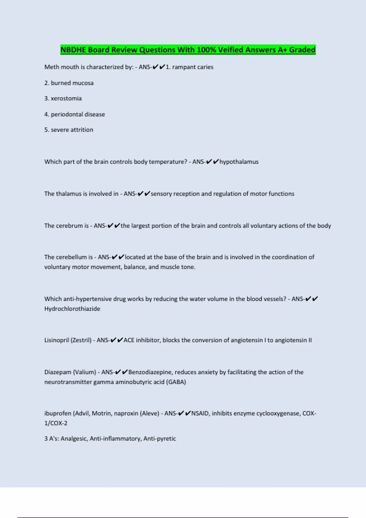 NBDHE Board Review Questions With 100% Veified Answers A+ Graded Meth mouth is characterized by: - ANS-1. rampant caries 2. burned mucosa 3. xerostomia 4. periodontal disease 5. severe attrition Which part of the brain controls body temperature? - ANS-hypothalamus The thalamus is involved in - ANS-sensory reception and regulation of motor functions The cerebrum is - ANS-the largest portion of the brain and controls all voluntary actions of the body The cerebellum is - ANS-located at the base of the brain and is involved in the coordination of voluntary motor movement, balance, and muscle tone. Which anti-hypertensive drug works by reducing the water volume in the blood vessels? - ANS- Hydrochlorothiazide Lisinopril (Zestril) - ANS-ACE inhibitor, blocks the conversion of angiotensin I to angiotensin II Diazepam (Valium) - ANS-Benzodiazepine, reduces anxiety by facilitating the action of the neurotransmitter gamma aminobutyric acid (GABA) ibuprofen (Advil, Motrin, naproxin (Aleve) - ANS-NSAID, inhibits enzyme cyclooxygenase, COX1/COX-2 3 A's: Analgesic, Anti-inflammatory, Anti-pyretic Continues....