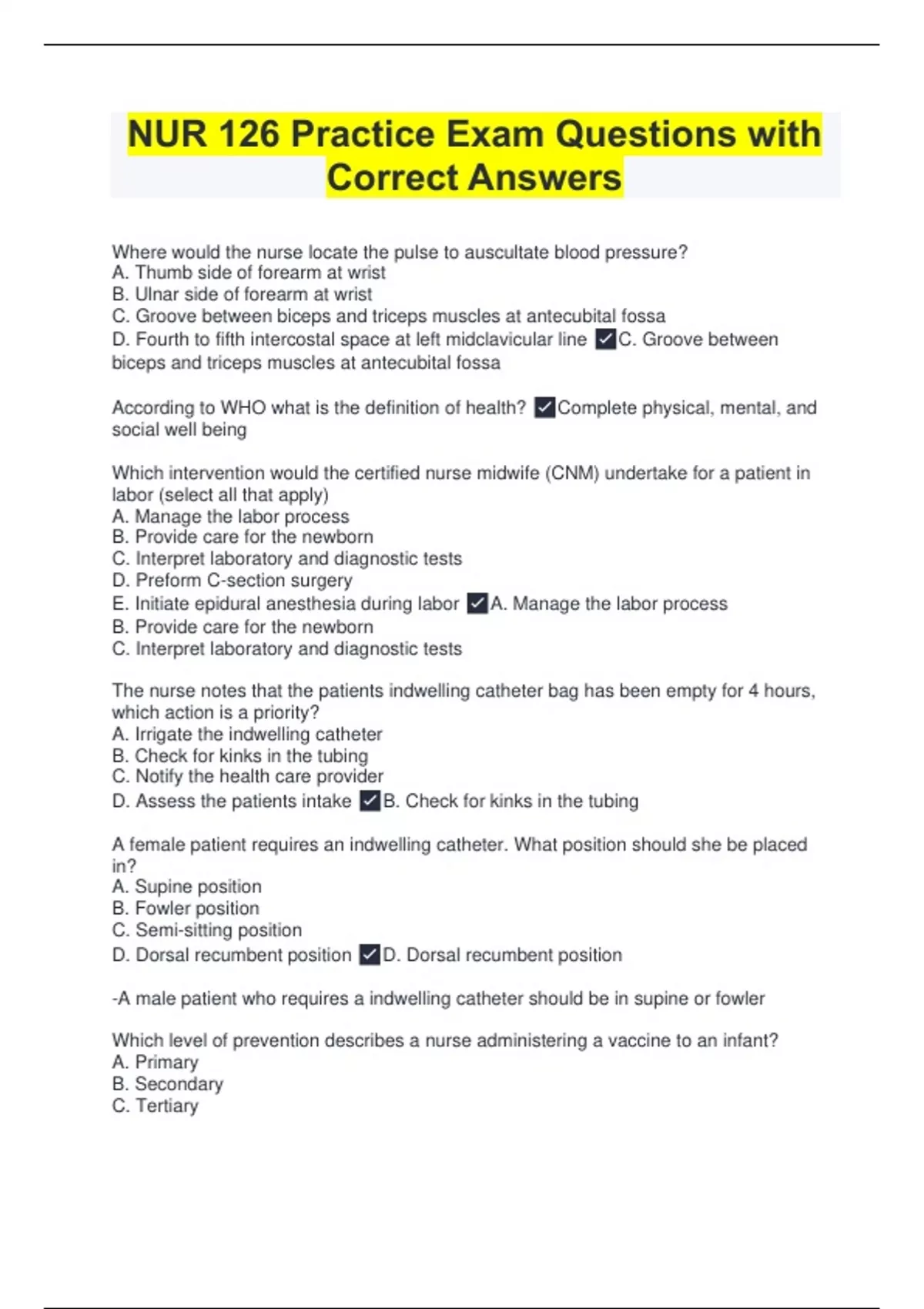 Where would the nurse locate the pulse to auscultate blood pressure? A. Thumb side of forearm at wrist B. Ulnar side of forearm at wrist C. Groove between biceps and triceps muscles at antecubital fossa D. Fourth to fifth intercostal space at left midclavicular line C. Groove between biceps and triceps muscles at antecubital fossa According to WHO what is the definition of health? Complete physical, mental, and social well being Which intervention would the certified nurse midwife (CNM) undertake for a patient in labor (select all that apply) A. Manage the labor process B. Provide care for the newborn C. Interpret laboratory and diagnostic tests D. Preform C-section surgery E. Initiate epidural anesthesia during labor A. Manage the labor process B. Provide care for the newborn C. Interpret laboratory and diagnostic tests The nurse notes that the patients indwelling catheter bag has been empty for 4 hours, which action is a priority? A. Irrigate the indwelling catheter B. Check for kinks in the tubing C. Notify the health care provider D. Assess the patients intake B. Check for kinks in the tubing A female patient requires an indwelling catheter. What position should she be placed in? A. Supine position B. Fowler position C. Semi-sitting position D. Dorsal recumbent position D. Dorsal recumbent position -A male patient who requires a indwelling catheter should be in supine or fowler Which level of prevention describes a nurse administering a vaccine to an infant? A. Primary B. Secondary C. Tertiary