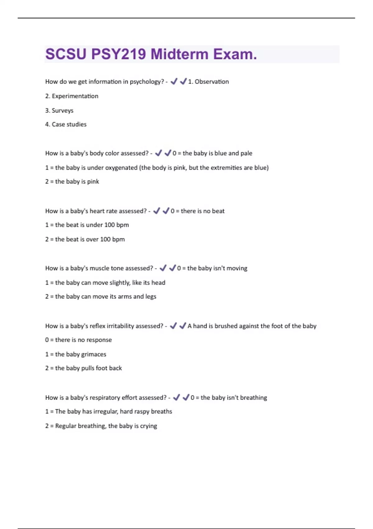How do we get information in psychology? - 1. Observation 2. Experimentation 3. Surveys 4. Case studies How is a baby's body color assessed? - 0 = the baby is blue and pale 1 = the baby is under oxygenated (the body is pink, but the extremities are blue) 2 = the baby is pink How is a baby's heart rate assessed? - 0 = there is no beat 1 = the beat is under 100 bpm 2 = the beat is over 100 bpm How is a baby's muscle tone assessed? - 0 = the baby isn't moving 1 = the baby can move slightly, like its head 2 = the baby can move its arms and legs How is a baby's reflex irritability assessed? - A hand is brushed against the foot of the baby 0 = there is no response 1 = the baby grimaces 2 = the baby pulls foot back How is a baby's respiratory effort assessed? - 0 = the baby isn't breathing 1 = The baby has irregular, hard raspy breaths 2 = Regular breathing, the baby is cryingWhat are a baby's reflexes when they are born? - sucking, rooting, startle, grasps (palmer and plantner) What are copy number variations? - Genes with various repeats or deletions of base pairs What are Erikson's 8 developmental stages? - 1. Trust vs. Mistrust 2. Autonomy vs. Shame and Doubt 3. Initiative vs. Guilt 4. Industry vs. Inferiority 5. Identity vs. Role Confusion 6. Intimacy vs. Isolation 7. Generative vs. Stagnation 8. Integrity vs. Despair What are Erikson's ideas? - He described 8 developmental stages, each characterized by a particular challenege, or developmental crisis What are Kohlburg's develop morality stages? - 1. Preconventional 2. Conventional 3. Post conventional What are Piaget's six-sensory preopperational thinking - 1. Centration 2. Egocentrism 3. Focus on appearance 4. Static reasoning 5. Animism 6. Irreversibility What are stem cells? - Cells from which any other specialized type of cell can formWhat are teratogens? - Agents that disrupt development of the fetus What are the 3 ways to look at someone? - 1. Biological way 2. Cognitive way 3. Psychological way What are the 4 different styles of parenting? - 1. Authoritative 2. Authoritarian 3. Permissive 4. Neglectful/uninvolved What are the 5 functions of a supportive family? - 1. Satisfy children's physical needs 2. Encourage learning 3. Support friendships 4. Protect self-respect 5. Provide a safe, stable, and harmonious home What are the different family structures? - Nuclear, one parent, traditional, same sex parents, grandparent/extended, or blended What are the different types of aggression? - 1. Instrumental aggression 2. Reactive aggression 3. Bullying What are the different types of attachments? - 1. Secure 2. Insecure: avoidant or ambivalent 3. DisorganizedWhat are the different types of families? - 1. Vulnerable 2. Restorable 3. Supportable/kinship What are the different types of play interaction? - 1. Solitary 2. Onlooker 3. Associate 4. Cooperative What are the five insights we take away from the life-span perspective? - 1. Development is multidirectional 2. Development is multicontextual 3. Development is multicultural 4. Development is multidisciplinary 5. Development is plastic What are the steps of the scientific method? - 1. Think about something 2. Hypothesize 3. Test it 4. Gather data and analyze 5. Share the results What are the years of adolescence? - 11 to 18 What are the years of adulthood? - 25 to 65