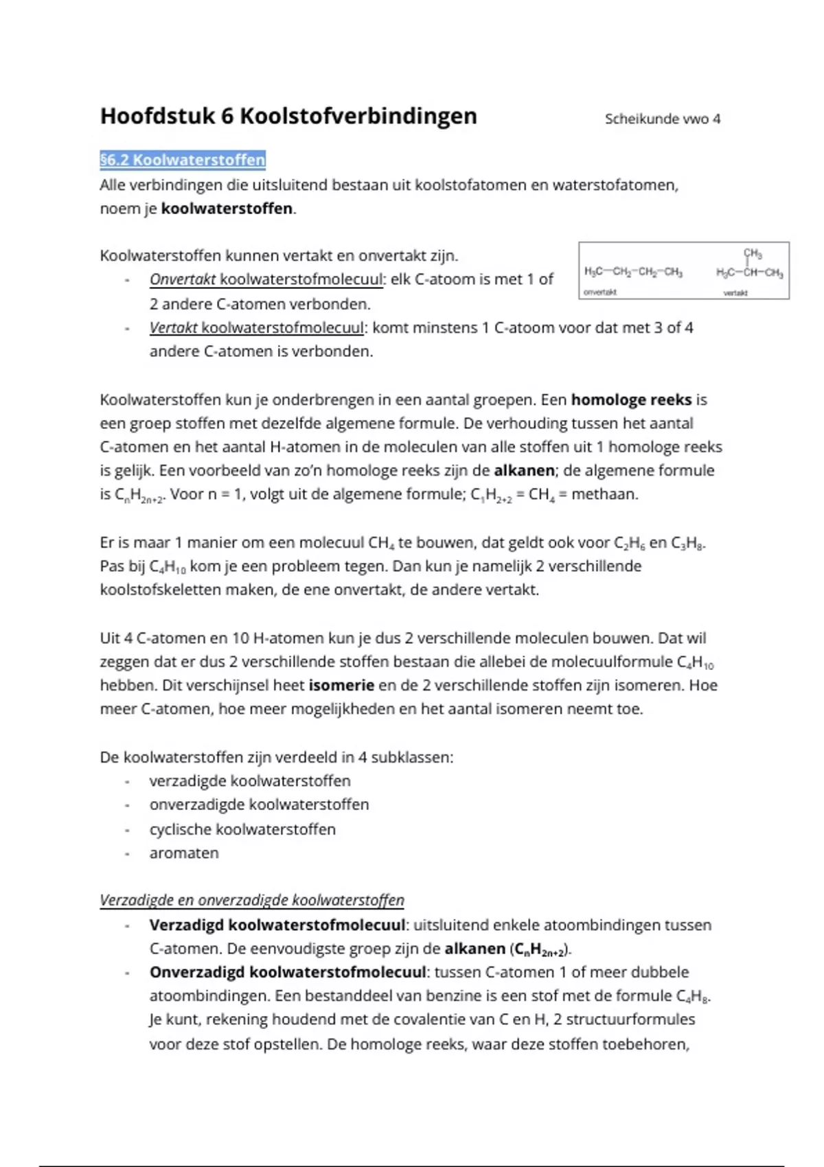- Vertakt koolwaterstofmolecuul: komt minstens 1 C-atoom voor dat met 3 of 4