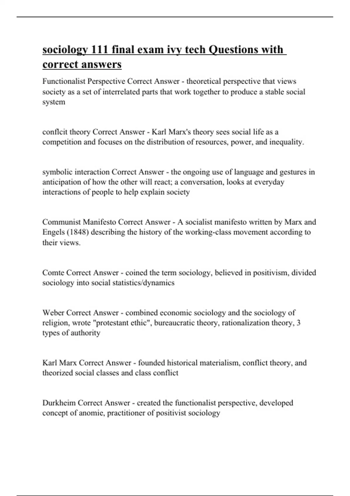 Functionalist Perspective Correct Answer - theoretical perspective that views society as a set of interrelated parts that work together to produce a stable social system conflcit theory Correct Answer - Karl Marx's theory sees social life as a competition and focuses on the distribution of resources, power, and inequality. symbolic interaction Correct Answer - the ongoing use of language and gestures in anticipation of how the other will react; a conversation, looks at everyday interactions of people to help explain society Communist Manifesto Correct Answer - A socialist manifesto written by Marx and Engels (1848) describing the history of the working-class movement according to their views. Comte Correct Answer - coined the term sociology, believed in positivism, divided sociology into social statistics/dynamics Weber Correct Answer - combined economic sociology and the sociology of religion, wrote "protestant ethic", bureaucratic theory, rationalization theory, 3 types of authority Karl Marx Correct Answer - founded historical materialism, conflict theory, and theorized social classes and class conflict Durkheim Correct Answer - created the functionalist perspective, developed concept of anomie, practitioner of positivist sociology