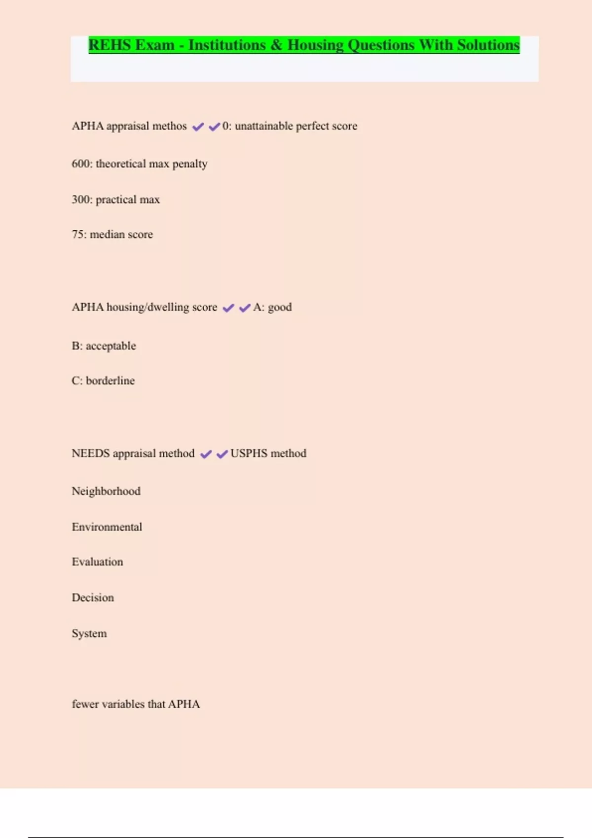 REHS Exam - Institutions & Housing Questions With Solutions APHA appraisal methos 0: unattainable perfect score 600: theoretical max penalty 300: practical max 75: median score APHA housing/dwelling score A: good B: acceptable C: borderline NEEDS appraisal method USPHS method Neighborhood Environmental Evaluation Decision System